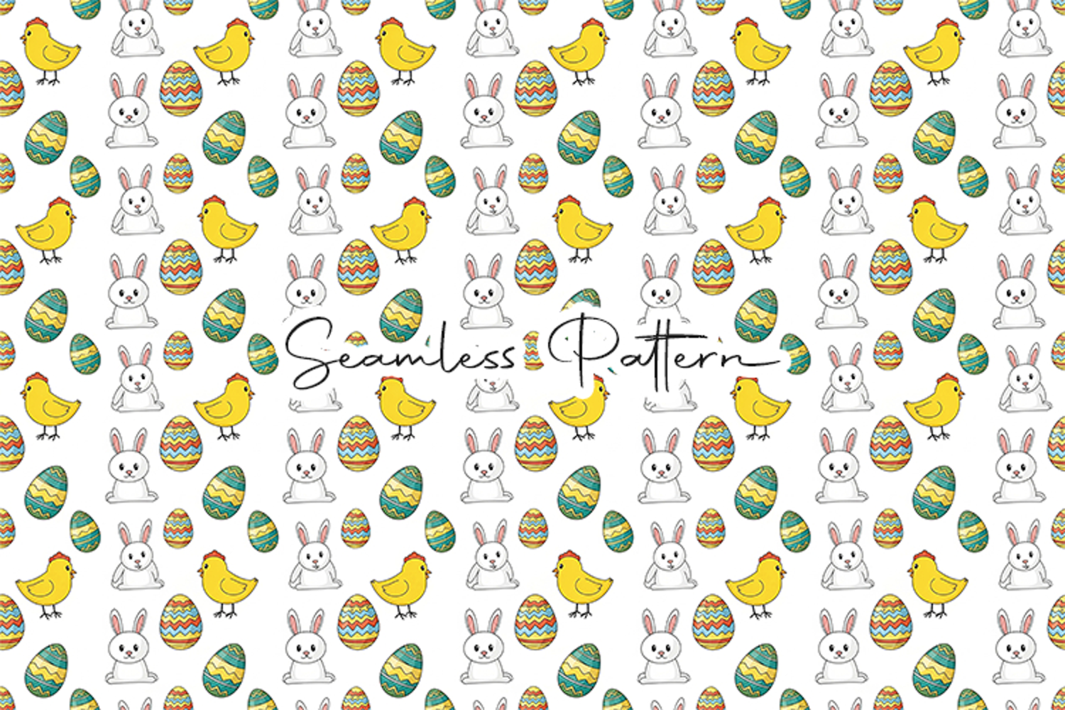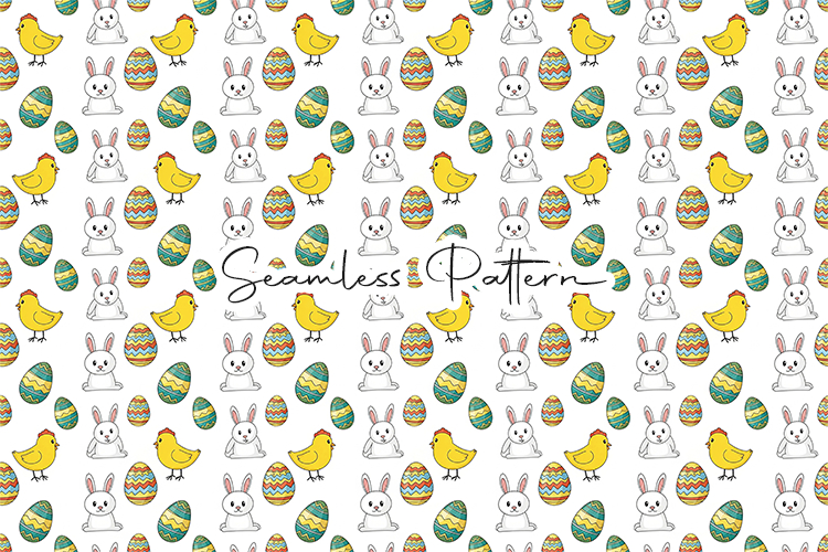 A fun Easter-themed seamless pattern filled with bunnies, chicks, and decorated eggs. Great for creating custom fabric, greeting cards, and holiday party decor.