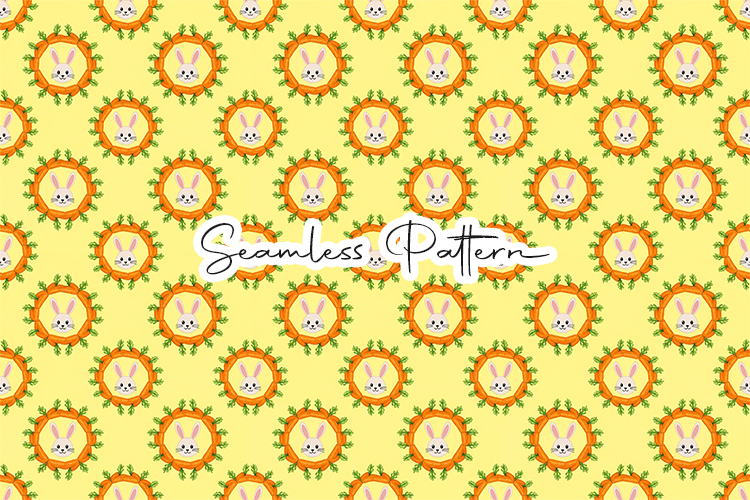 A bright and cheery seamless pattern showcasing bunny faces inside vibrant carrot wreaths. Perfect for spring-themed home decor, textiles, and festive gift wrapping.