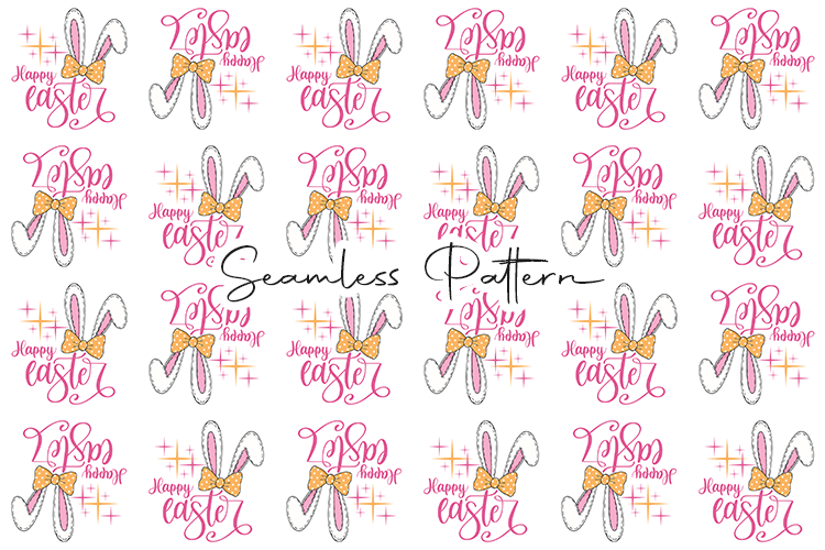 A stylish seamless pattern featuring "Happy Easter" typography, cute bunny ears with bows, and sparkling accents. Great for holiday cards, apparel, and festive party decorations.