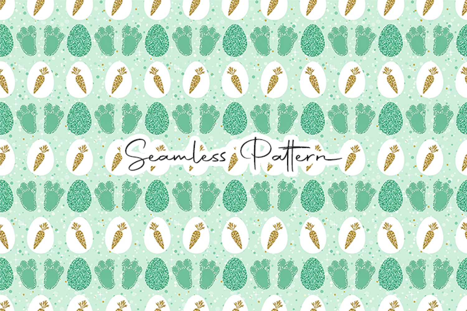 Cute Easter seamless pattern featuring bunny footprints, decorative eggs, and small carrot icons in a soft pastel repeating design. Perfect for fabric printing, wrapping paper, scrapbooking, nursery decor, and surface pattern design.