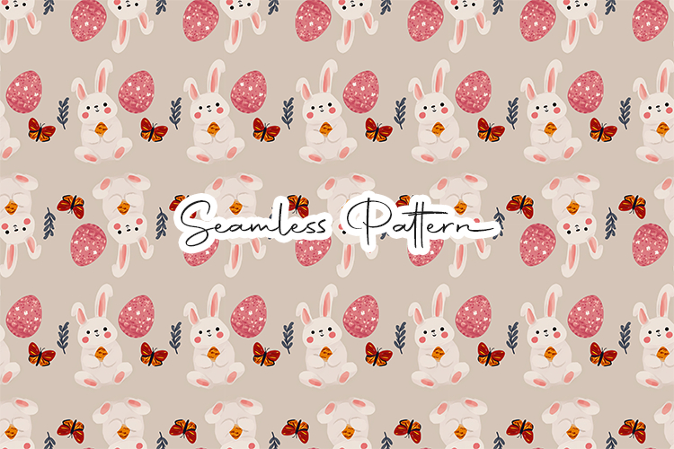 Adorable Easter seamless pattern featuring cute bunnies, pink decorated eggs, butterflies, and small leaves on a soft neutral background. Perfect for fabric printing, wrapping paper, scrapbooking, sublimation, nursery decor, and spring craft projects.