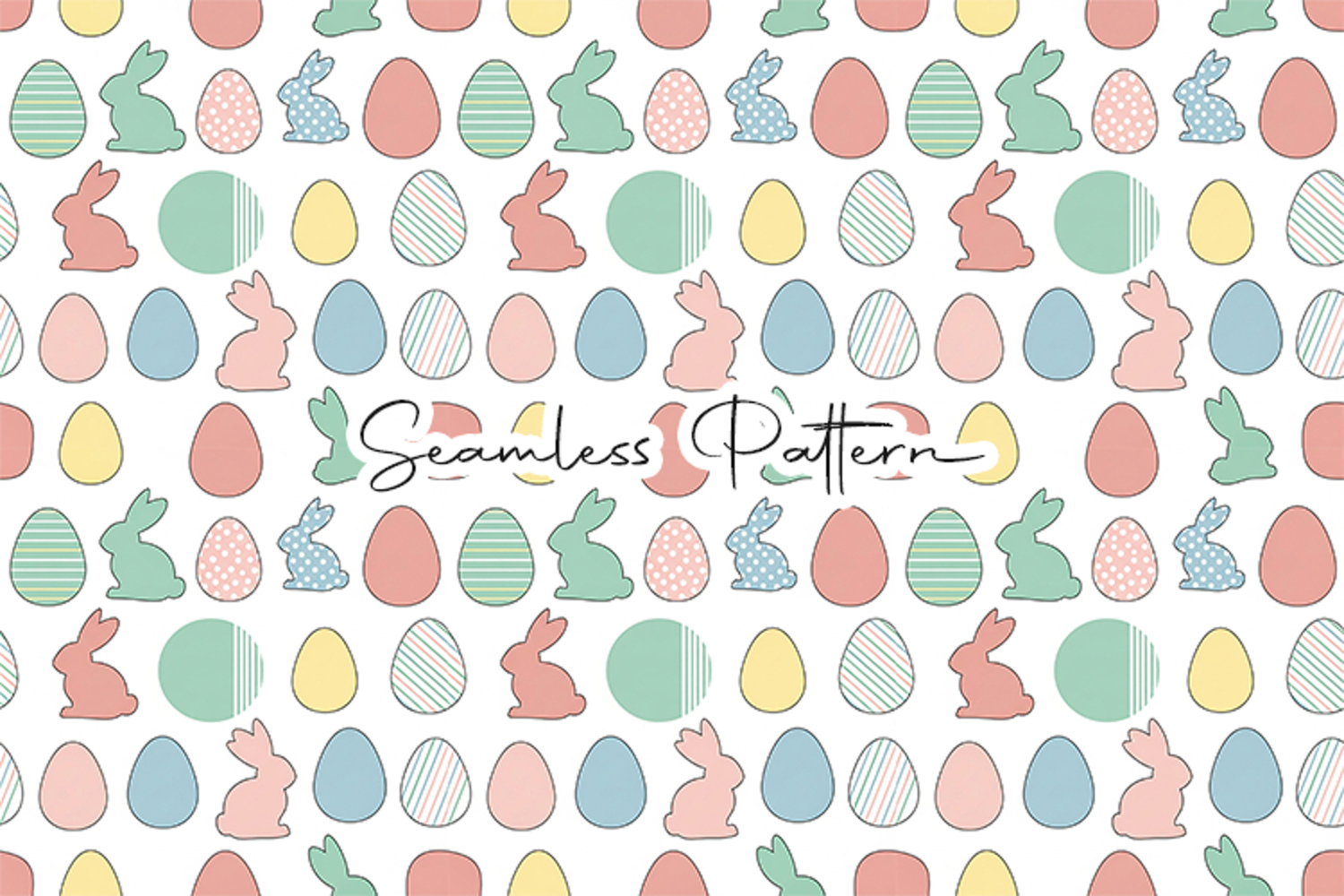 Cute Easter seamless pattern featuring colorful pastel eggs and bunny silhouettes. This 12x12 inch seamless pattern (JPG, 300 DPI) is perfect for fabric printing, wrapping paper, scrapbooking, nursery decor, wallpaper, and other spring or Easter themed creative projects.