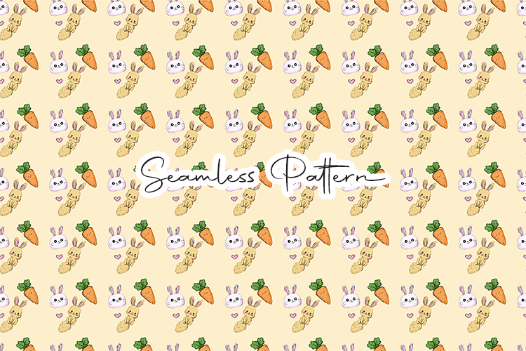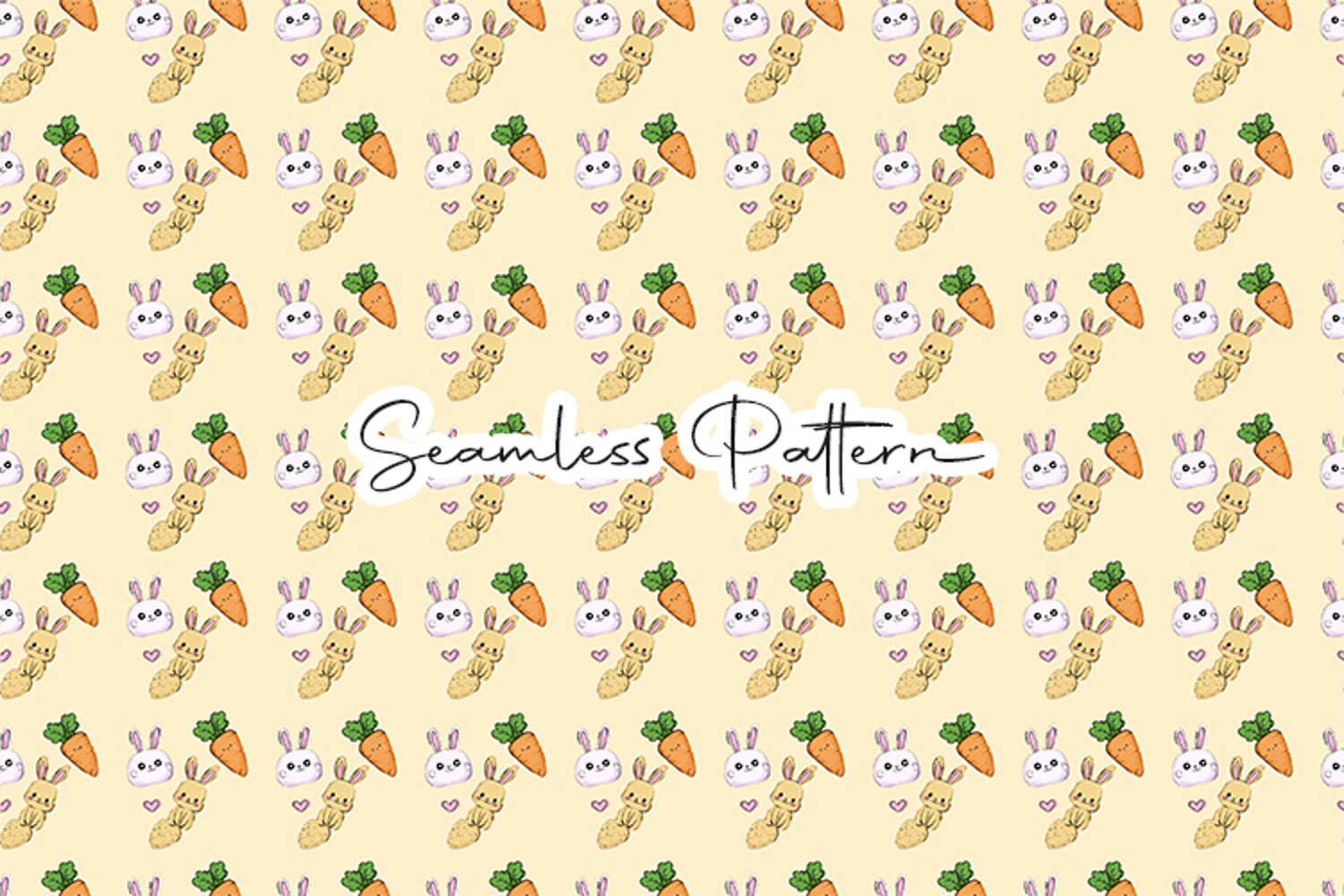Adorable seamless pattern featuring cute cartoon bunnies, carrots, and tiny hearts arranged in a playful design. This 12x12 inch seamless pattern (JPG, 300 DPI) is perfect for fabric printing, wrapping paper, scrapbooking, nursery decor, stationery, and Easter themed creative projects.