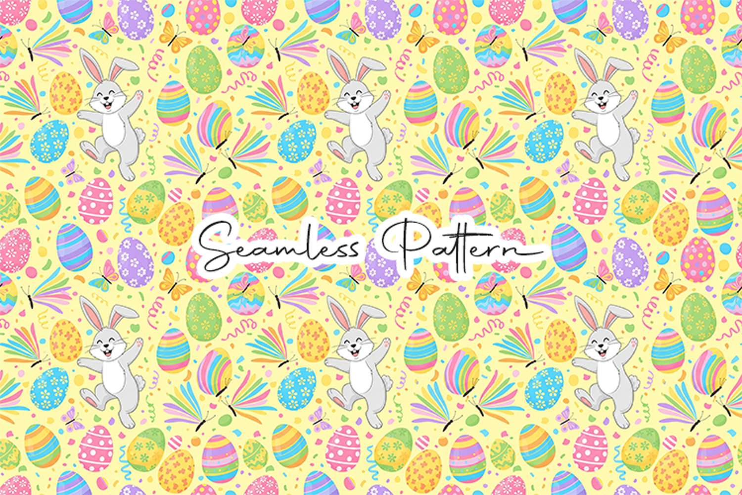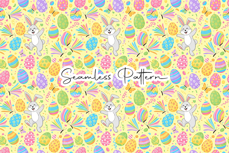Bright and festive seamless pattern featuring cheerful bunnies, colorful Easter eggs, butterflies, and confetti elements. This 12x12 inch seamless pattern (JPG, 300 DPI) is perfect for fabric printing, wrapping paper, scrapbooking, party decor, stationery, and fun Easter themed creative projects.