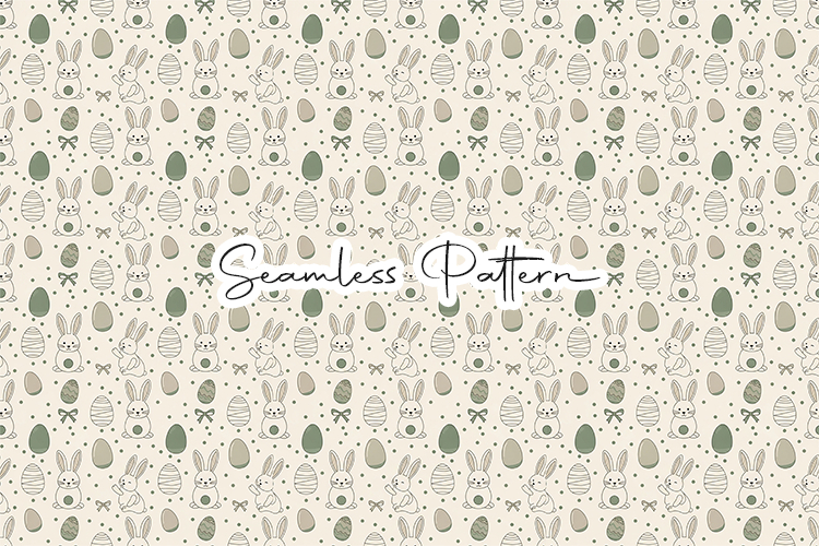 Minimal Easter seamless pattern featuring cute line-art bunnies, decorated eggs, bows, and dots in soft neutral tones. This 12x12 inch seamless pattern (JPG, 300 DPI) is perfect for fabric printing, wrapping paper, scrapbooking, nursery decor, stationery, and modern Easter themed creative projects.