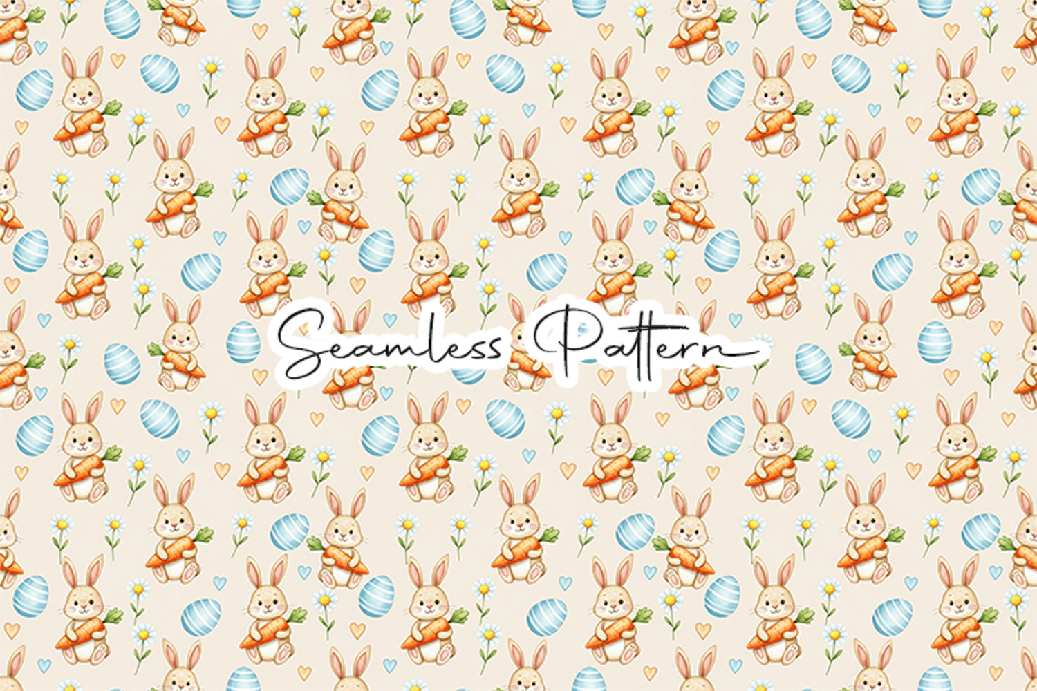 Adorable seamless pattern featuring cute bunnies holding carrots with Easter eggs, flowers, and hearts in soft pastel colors. This 12x12 inch seamless pattern (JPG, 300 DPI) is perfect for fabric printing, wrapping paper, scrapbooking, nursery decor, stationery, and Easter themed creative projects.