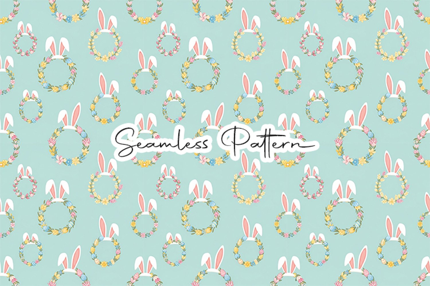 Charming Easter seamless pattern featuring floral wreaths with cute bunny ears on a soft pastel background. This 12x12 inch seamless pattern (JPG, 300 DPI) is perfect for digital paper, fabric printing, wrapping paper, scrapbooking, sublimation, and spring-themed craft projects.