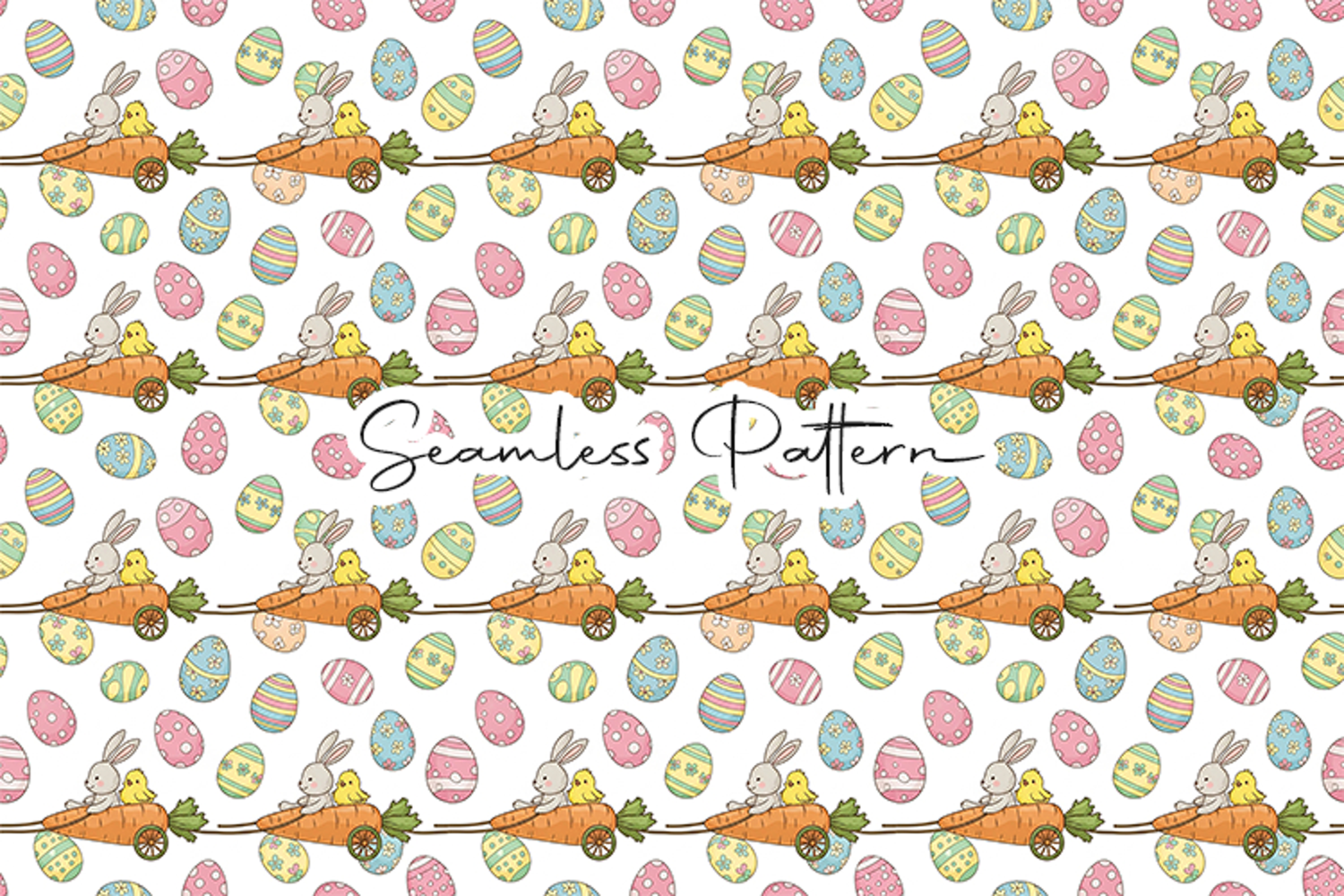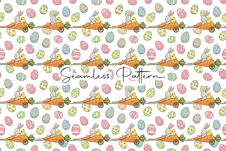Adorable Easter seamless pattern featuring a bunny and chick riding a carrot cart surrounded by colorful decorated eggs. This 12x12 inch seamless pattern (JPG, 300 DPI) is perfect for digital paper, fabric printing, wrapping paper, scrapbooking, sublimation, and Easter-themed craft projects.