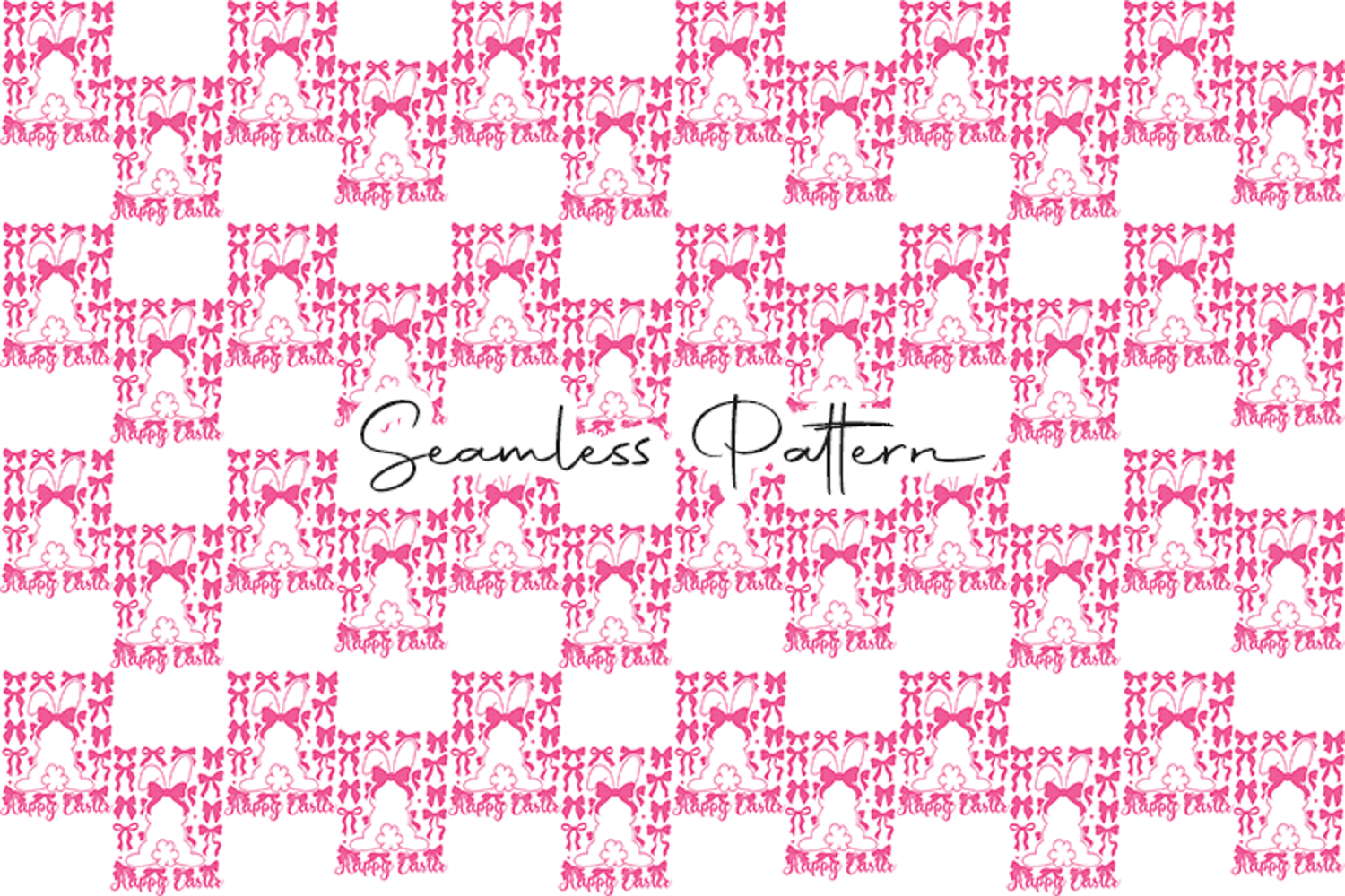 Charming Easter seamless pattern featuring decorative bunny silhouettes with bows and the phrase “Happy Easter.” This 12x12 inch seamless pattern (JPG, 300 DPI) is perfect for digital paper, fabric printing, wrapping paper, scrapbooking, sublimation, and Easter-themed creative projects.