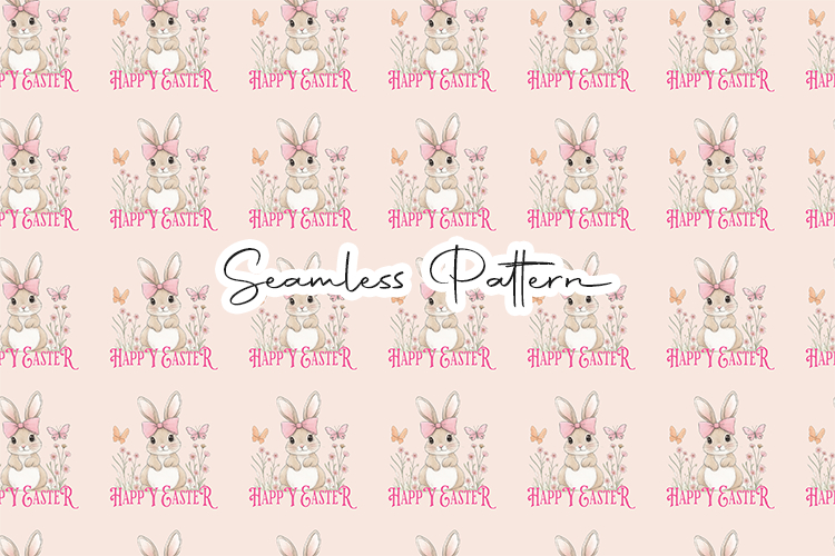 Adorable Happy Easter bunny seamless pattern featuring a cute rabbit with a bow, flowers, and butterflies in a repeating design. This high-quality 12x12 inch JPG file at 300 DPI is perfect for Easter crafts, fabric printing, scrapbooking, wrapping paper, sublimation, digital paper, nursery decor, and other spring-themed creative projects.