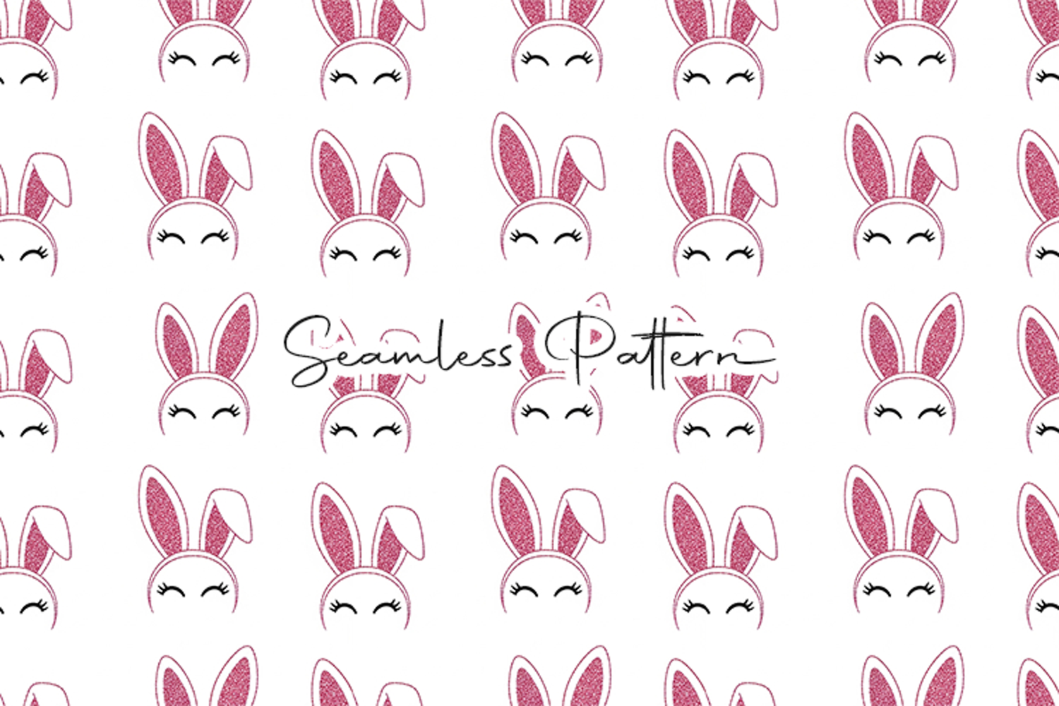 Adorable pink bunny face seamless pattern featuring cute closed-eye bunny faces with glitter-style ears in a repeating design. This high-quality 12x12 inch JPG file at 300 DPI is perfect for Easter crafts, fabric printing, scrapbooking, wrapping paper, sublimation, nursery decor, and other spring-themed creative projects.
