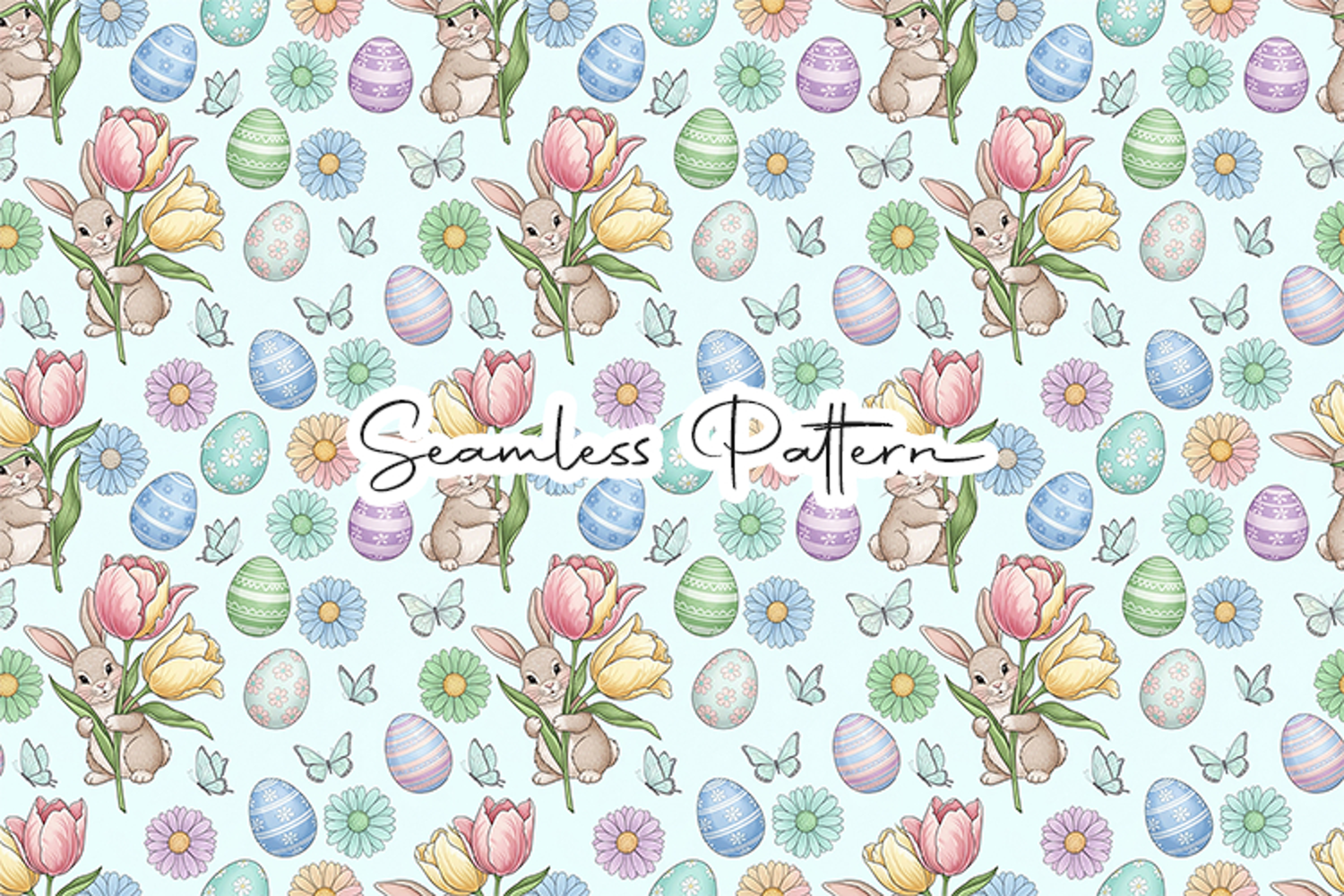 Beautiful Easter bunny, eggs, and floral seamless pattern featuring cute rabbits, colorful decorated eggs, tulips, flowers, and butterflies in a soft spring design. Perfect for Easter crafts, fabric printing, wrapping paper, scrapbooking, sublimation, and digital paper projects.