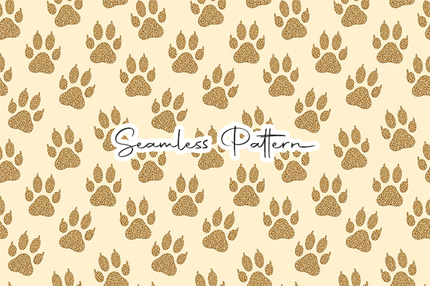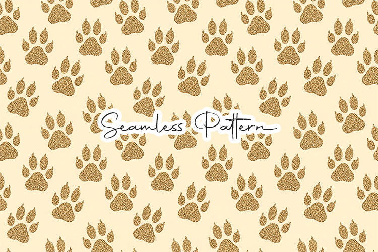 Elegant gold paw print seamless pattern featuring glitter-style paw prints arranged in a repeating layout on a soft neutral background. Perfect for pet-themed crafts, fabric printing, wrapping paper, scrapbooking, sublimation, and digital design projects.