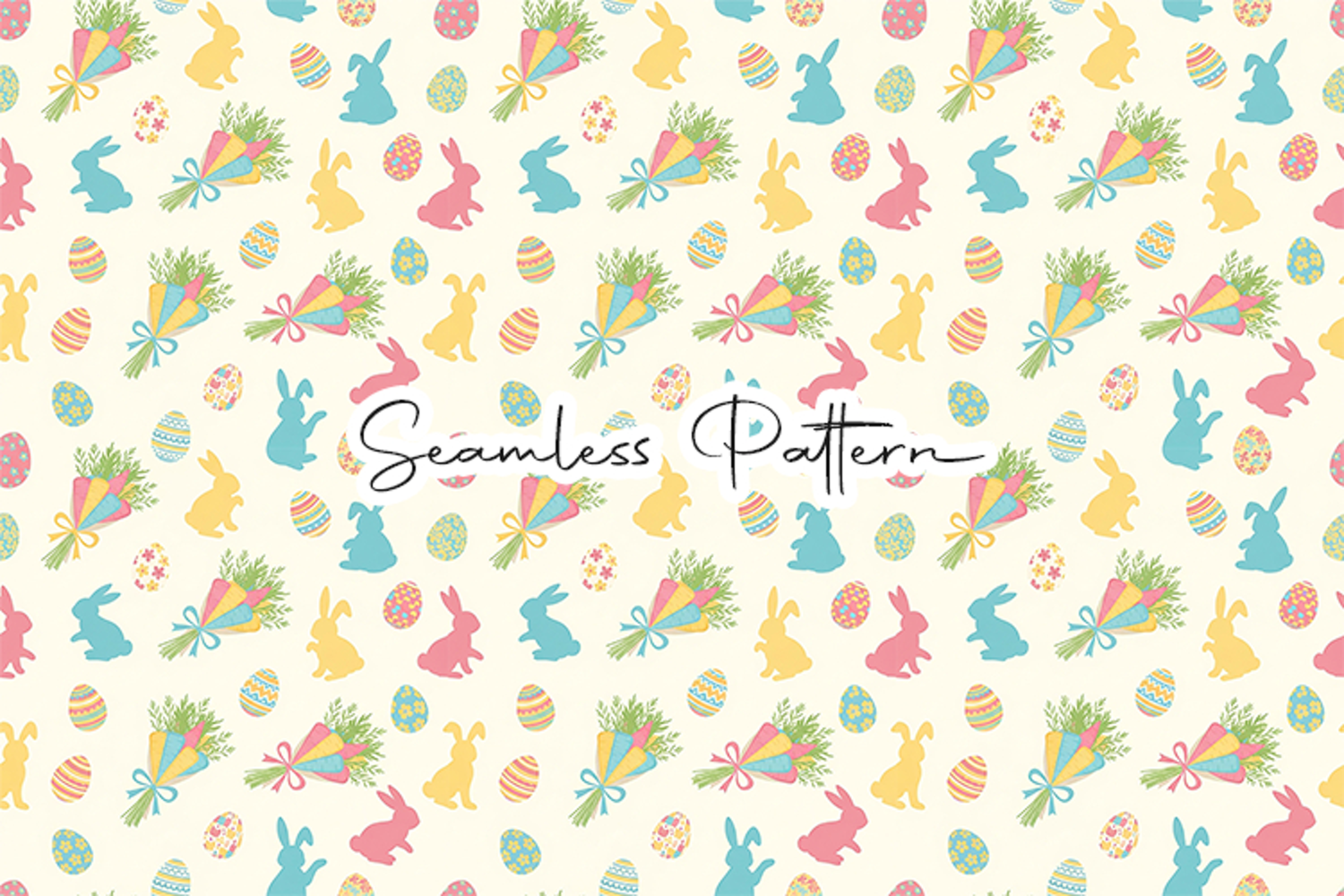 Playful Easter bunny silhouette seamless pattern with colorful eggs and carrot bouquets on a soft pastel background. This 12x12 inch JPG file at 300 DPI is perfect for fabric printing, scrapbooking, wrapping paper, sublimation, digital paper, and Easter or spring craft projects.