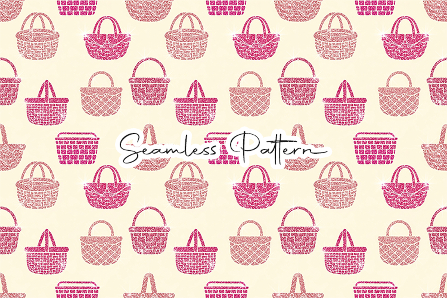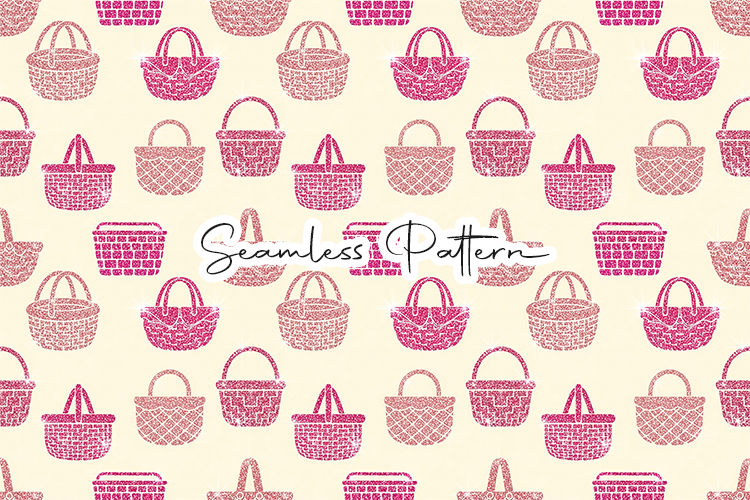 Beautiful pink Easter basket seamless pattern with decorative basket illustrations arranged in a clean repeating layout. Perfect for fabric prints, wrapping paper, scrapbooking, digital backgrounds, and craft projects. File included: 12x12 inches JPG, 300 DPI high-resolution seamless pattern.