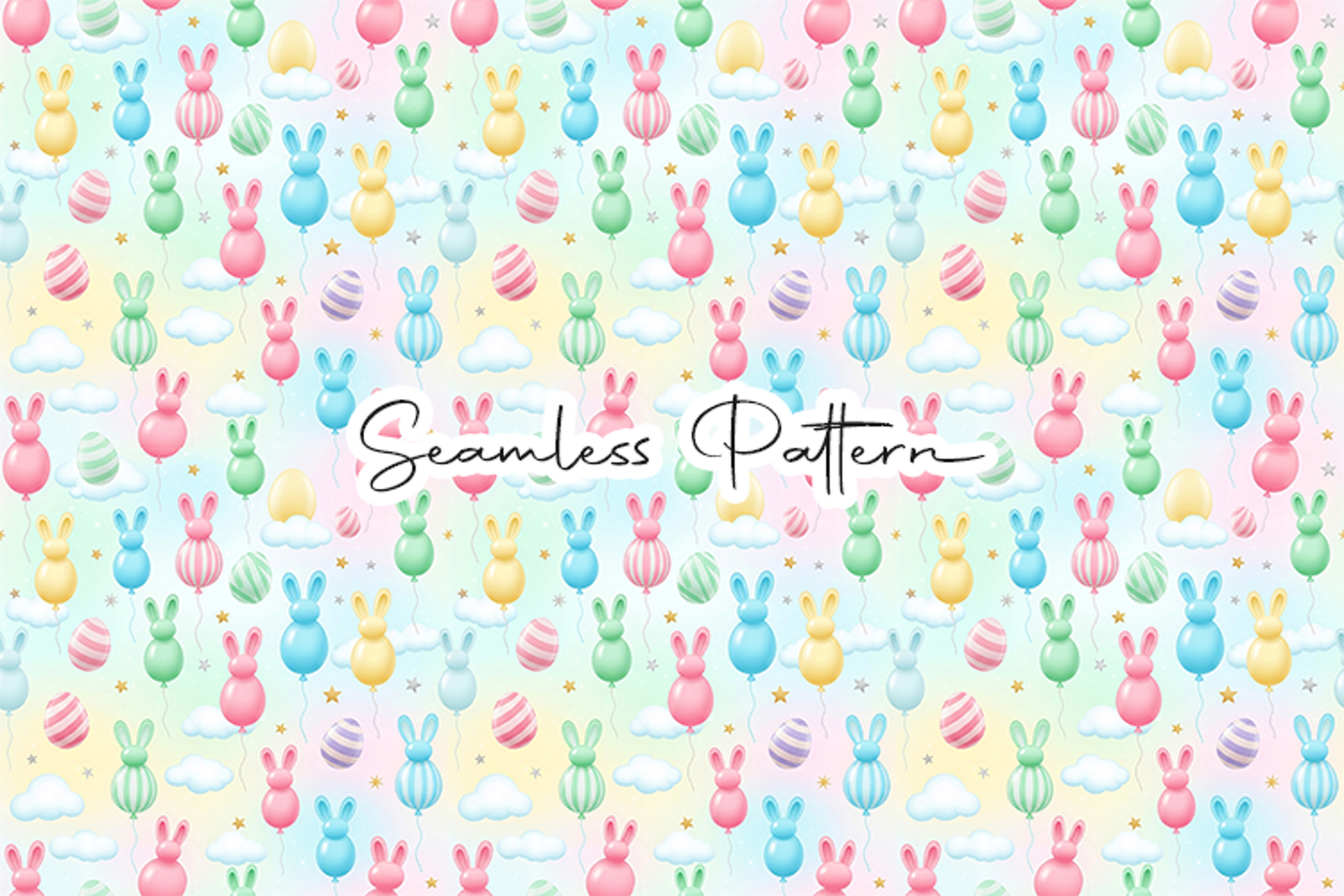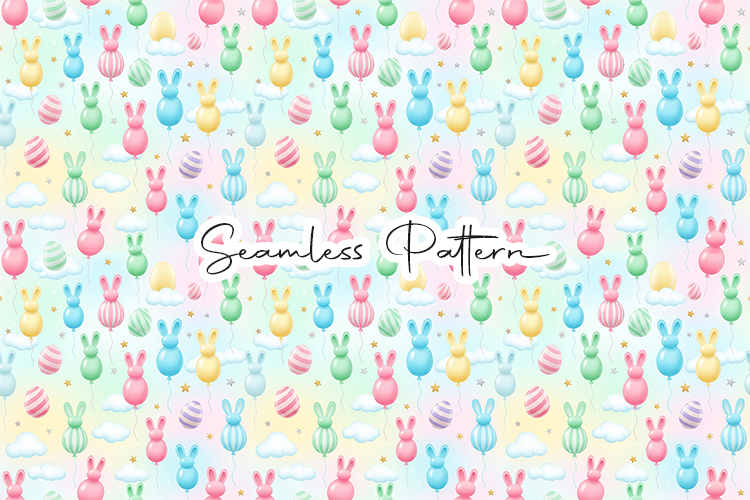 Adorable Easter seamless pattern featuring colorful pastel bunny shapes, decorated eggs, clouds, and stars arranged in a playful repeating layout. Perfect for fabric printing, wrapping paper, nursery decor, scrapbooking, and digital craft projects. File included: 12×12 inches JPG, 300 DPI high-resolution seamless pattern.
