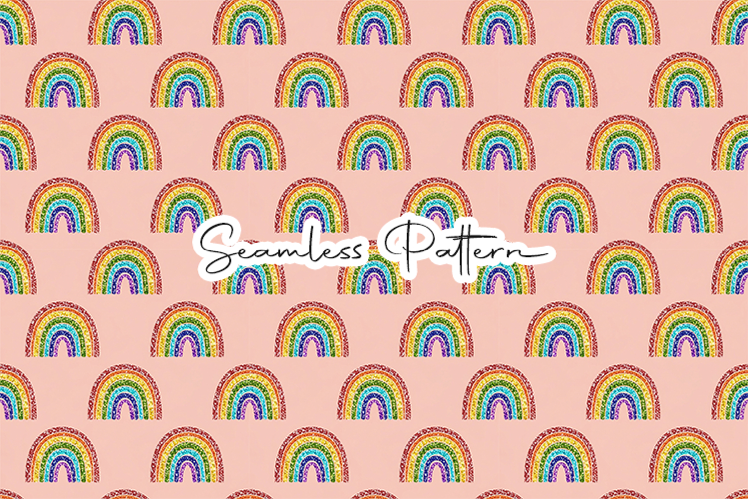 Bright glitter-style rainbow seamless pattern featuring colorful rainbow arches arranged in a soft repeating layout on a pastel background. Perfect for nursery decor, fabric printing, wrapping paper, scrapbooking, and digital craft projects. File included: 12×12 inches JPG, 300 DPI high-resolution seamless pattern.