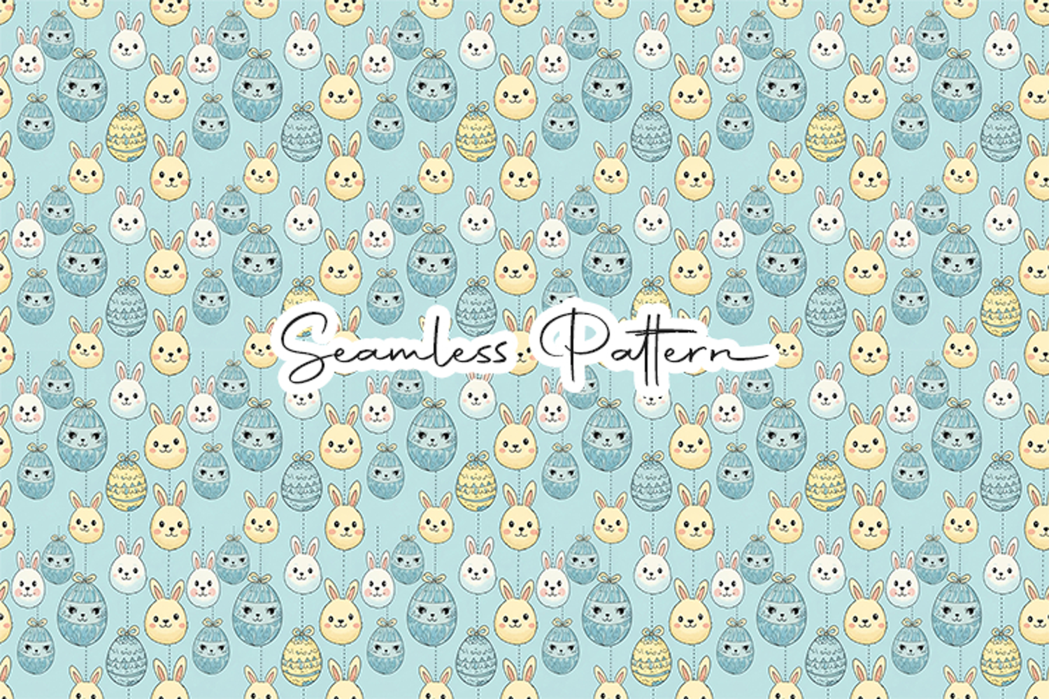 Adorable Easter bunny faces and decorated eggs seamless pattern in soft pastel colors. This high-quality 12x12 inch JPG file at 300 DPI is perfect for fabric printing, wrapping paper, scrapbooking, sublimation, digital paper, and other Easter or spring themed creative projects.