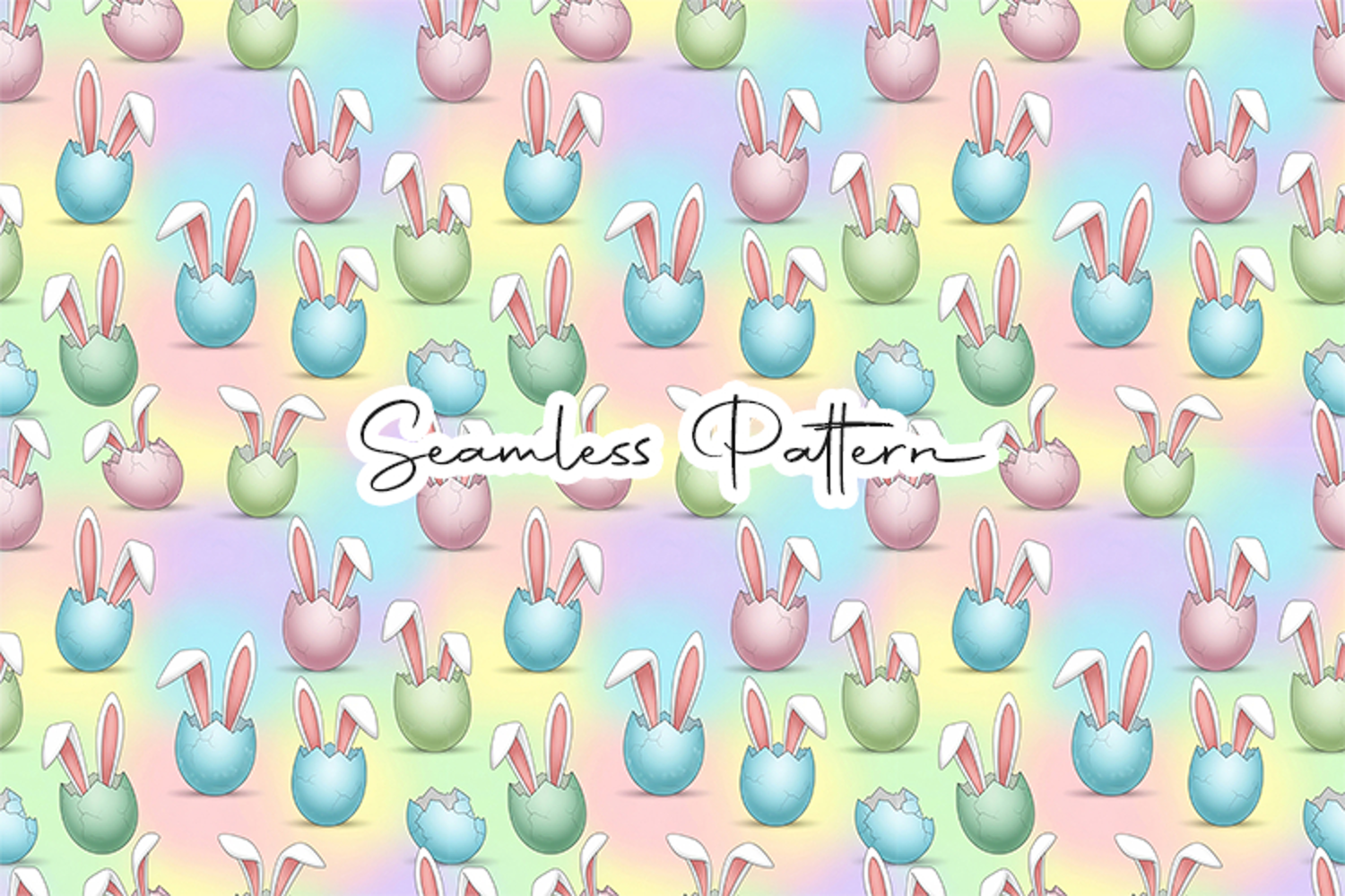 Adorable pastel bunny ears in cracked eggs seamless pattern on a soft rainbow background. This 12x12 inch JPG file at 300 DPI is perfect for fabric printing, wrapping paper, scrapbooking, sublimation, digital paper, and other Easter or spring themed creative projects.