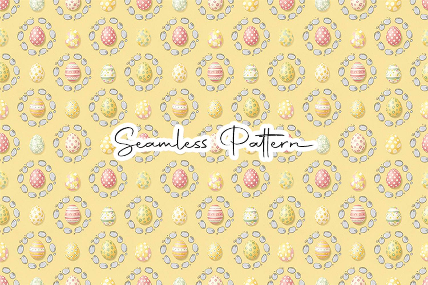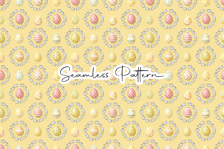 Beautiful pastel decorated Easter eggs seamless pattern arranged in a repeating design on a soft yellow background. This 12x12 inch JPG file at 300 DPI is perfect for fabric printing, wrapping paper, scrapbooking, sublimation, digital paper, and other Easter or spring themed creative projects.