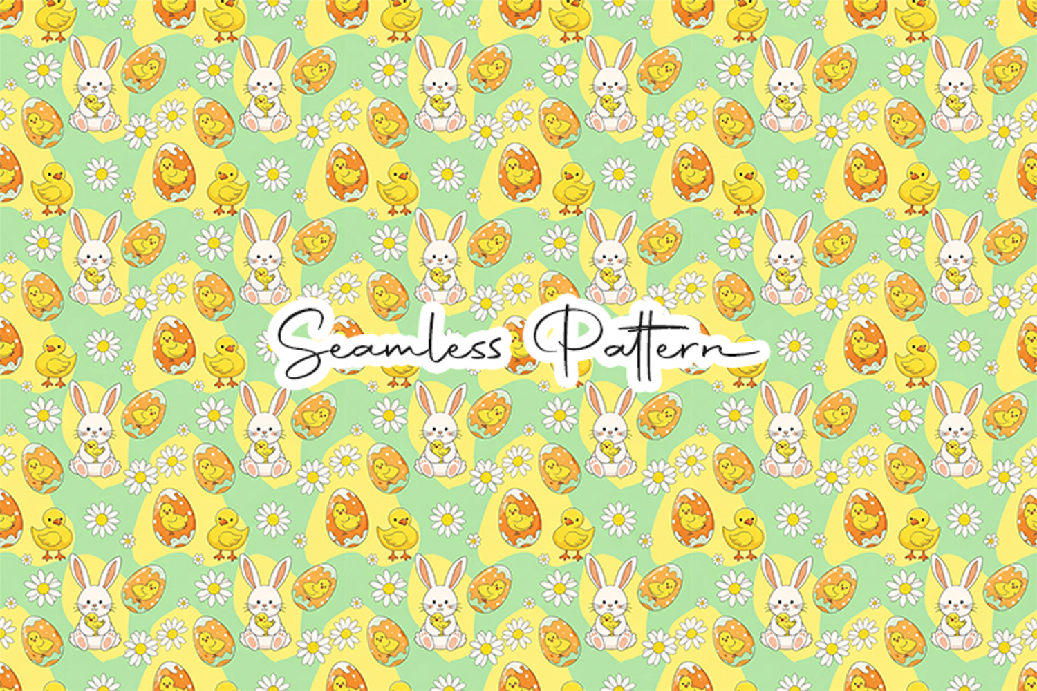 Adorable Easter bunny, chicks, daisies, and decorated eggs seamless pattern on a soft pastel background. This 12x12 inch JPG file at 300 DPI is perfect for fabric printing, wrapping paper, scrapbooking, sublimation, digital paper, and other Easter or spring themed creative projects.