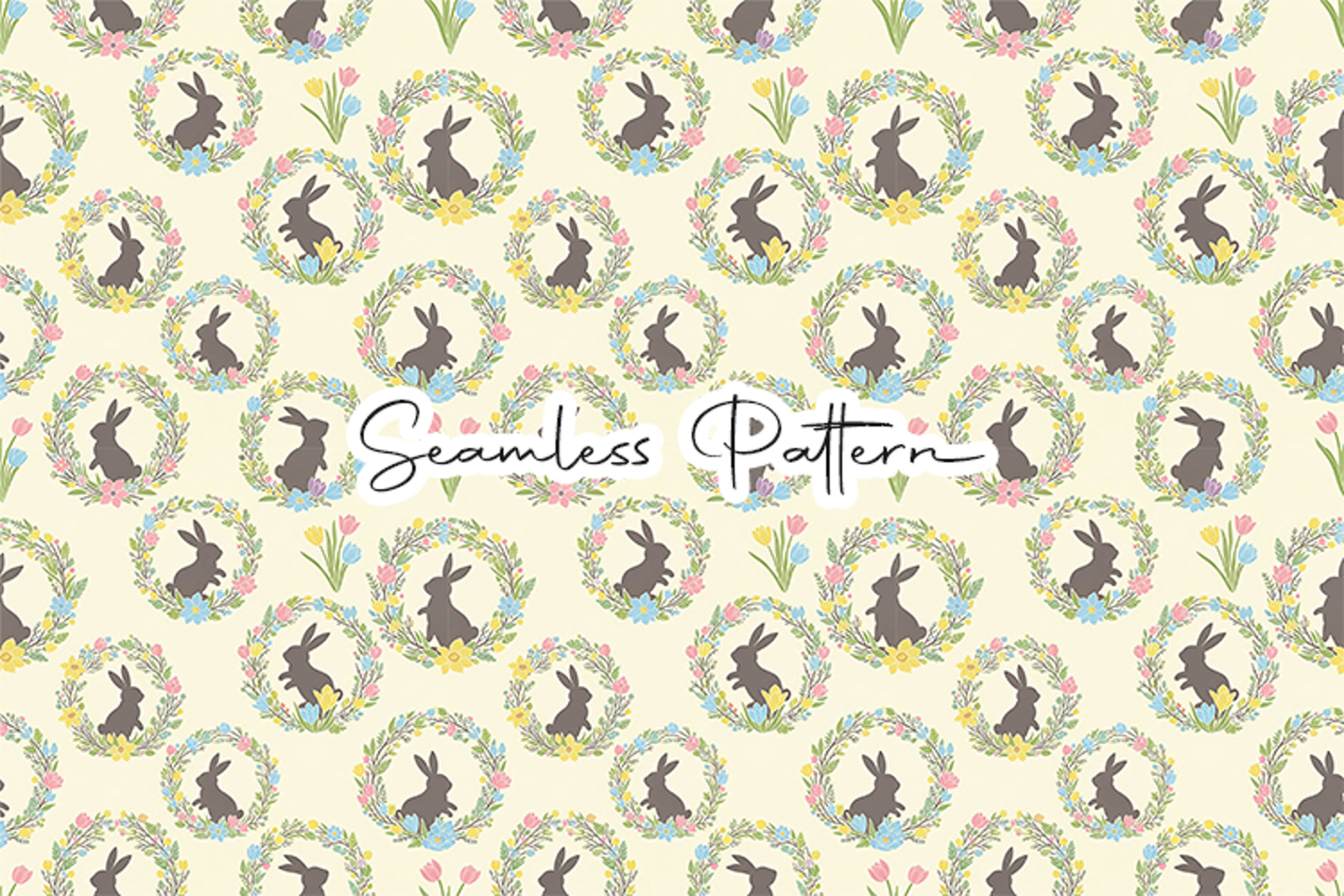 Charming bunny silhouette inside floral wreaths seamless pattern with delicate spring flowers and soft pastel colors. This 12x12 inch JPG file at 300 DPI is perfect for fabric printing, wrapping paper, scrapbooking, sublimation, digital paper, and other Easter or spring themed creative projects.