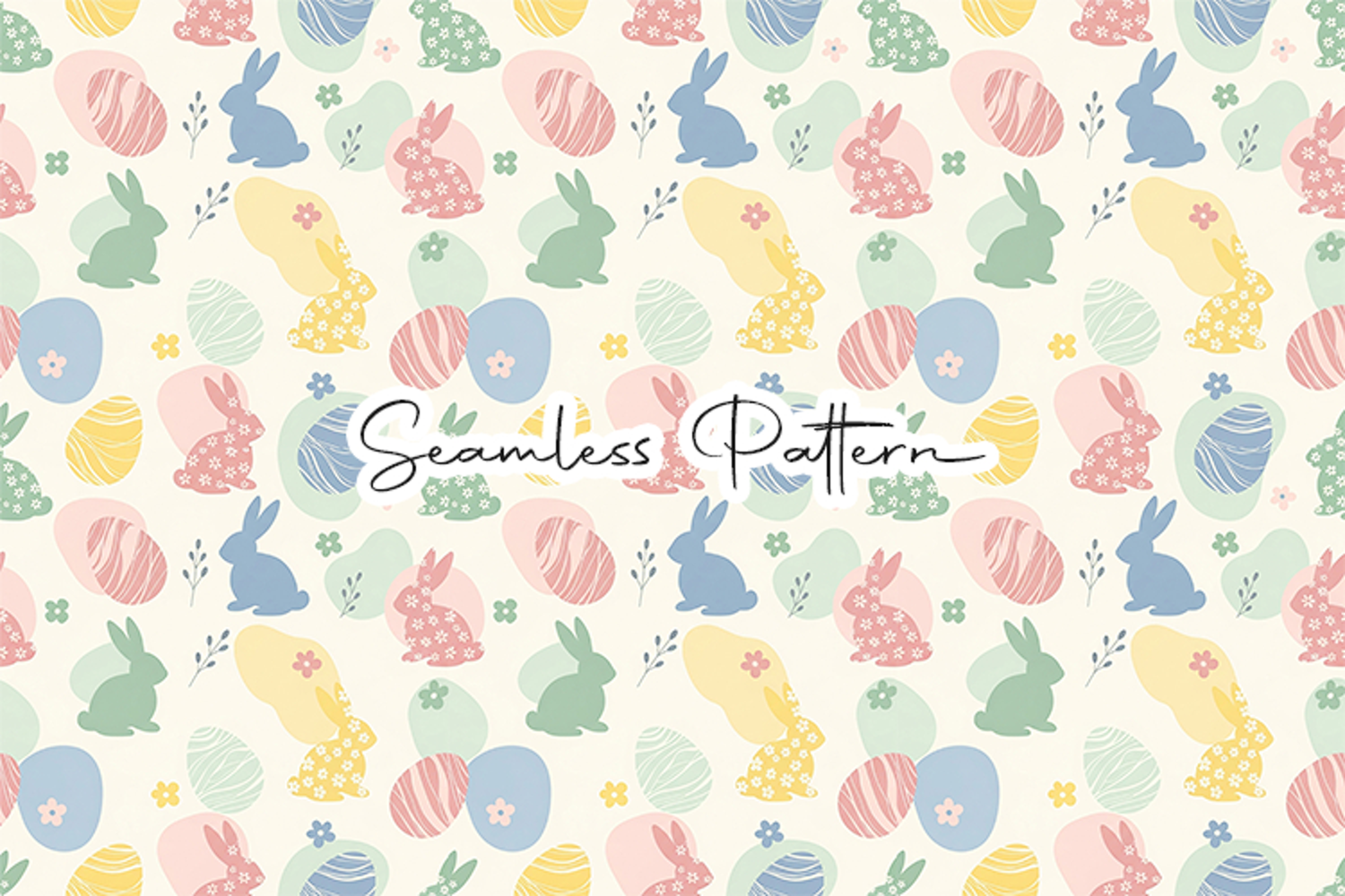 Cute pastel Easter bunny silhouettes and decorated eggs seamless pattern with playful spring colors and floral accents. This 12x12 inch JPG file at 300 DPI is perfect for fabric printing, wrapping paper, scrapbooking, sublimation, digital paper, and other Easter or spring themed creative projects.