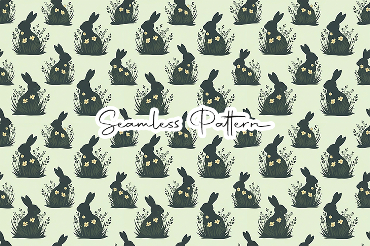 Elegant spring seamless pattern featuring bunny silhouettes sitting in grassy fields with delicate wildflowers in a soft botanical style. This 12x12 inch JPG file at 300 DPI is perfect for fabric printing, wrapping paper, scrapbooking, sublimation, digital paper, and spring craft projects.