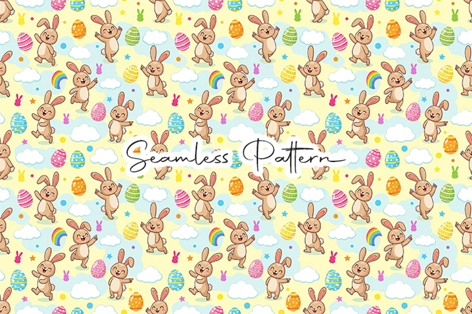 Fun and cheerful Easter seamless pattern featuring playful bunnies, colorful eggs, rainbows, clouds, and stars in a bright spring theme. This 12x12 inch JPG file at 300 DPI is perfect for fabric printing, wrapping paper, scrapbooking, sublimation, digital paper, and kids Easter craft projects.
