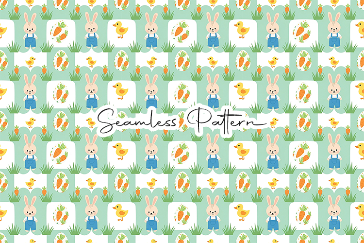Adorable Easter seamless pattern featuring cute bunnies in overalls, little chicks, carrots, and spring grass in a playful farm-style design. This 12x12 inch JPG file at 300 DPI is perfect for fabric printing, wrapping paper, scrapbooking, sublimation, digital paper, and Easter craft projects.