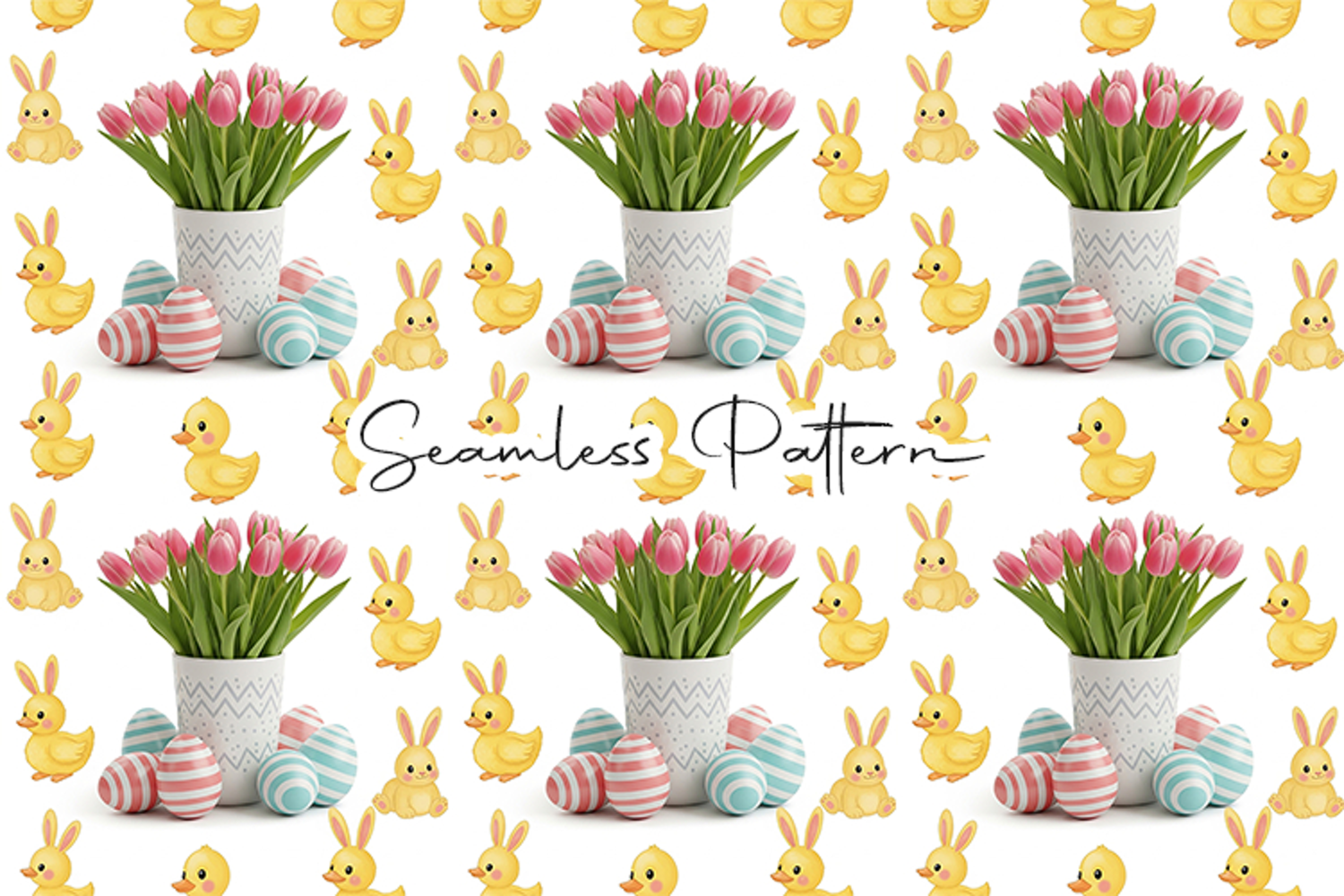 Adorable Easter seamless pattern featuring cute bunnies, yellow ducklings, colorful Easter eggs, and beautiful tulip bouquets in decorative pots. Perfect for spring and Easter themed projects. This design comes as a high-quality 12x12 inch JPG file at 300 DPI, ideal for fabric printing, digital paper, scrapbooking, wrapping paper, sublimation, and other creative crafts.