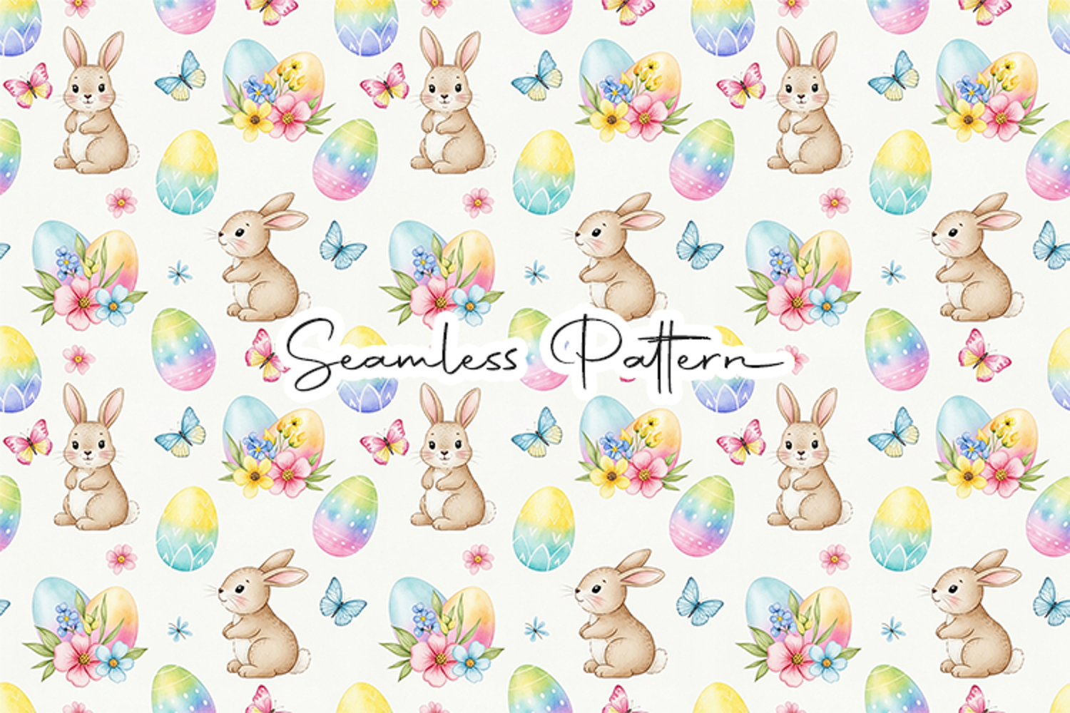 Adorable Easter seamless pattern featuring cute bunnies, pastel rainbow eggs, butterflies, and colorful spring flowers in a soft repeating design. Perfect for Easter and spring themed creative projects. This file is a high-quality 12x12 inch JPG at 300 DPI, ideal for fabric printing, digital paper, scrapbooking, wrapping paper, sublimation, and other craft designs.