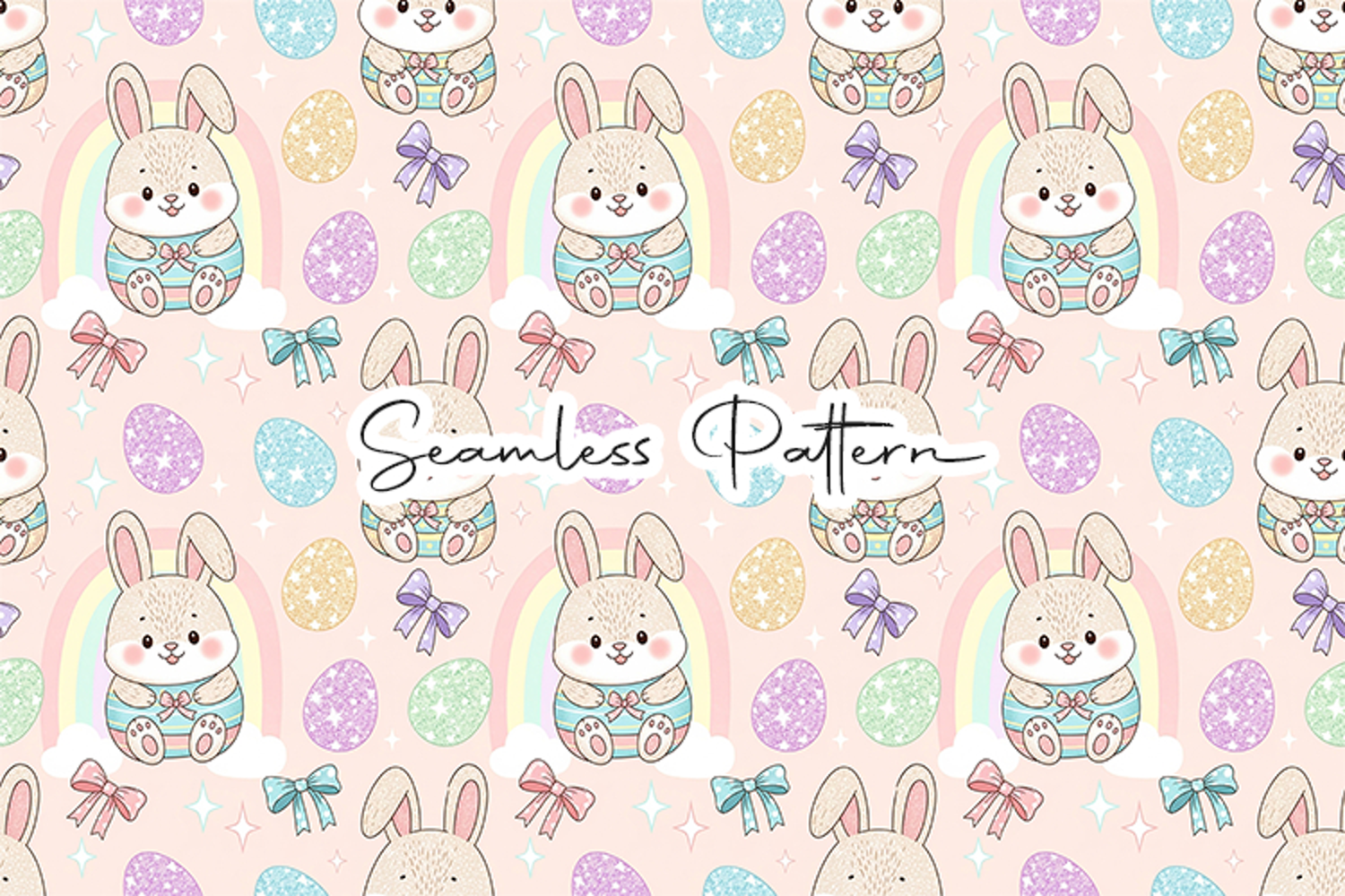 Adorable Easter seamless pattern featuring cute bunnies sitting on pastel rainbows with sparkling Easter eggs and decorative bows. Perfect for cheerful spring and Easter themed projects. This design comes as a high-quality 12x12 inch JPG file at 300 DPI, ideal for fabric printing, digital paper, scrapbooking, wrapping paper, sublimation, and other creative craft projects.