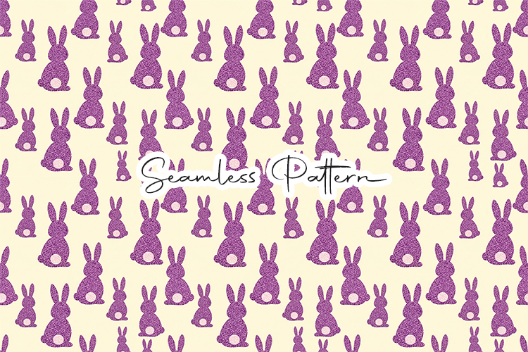 Cute purple glitter bunny seamless pattern featuring repeating rabbit silhouettes on a soft background. This high-quality 12x12 inch JPG file at 300 DPI is perfect for fabric printing, wrapping paper, scrapbooking, sublimation, digital paper, and other Easter or spring themed creative projects.