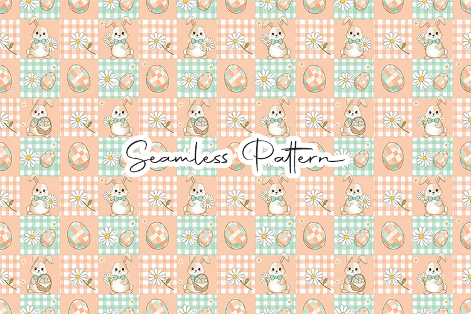 Adorable patchwork Easter seamless pattern featuring cute bunnies, daisies, and decorated eggs on a soft plaid background. This high-quality 12x12 inch JPG file at 300 DPI is perfect for fabric printing, wrapping paper, scrapbooking, sublimation, digital paper, and Easter or spring themed creative projects.