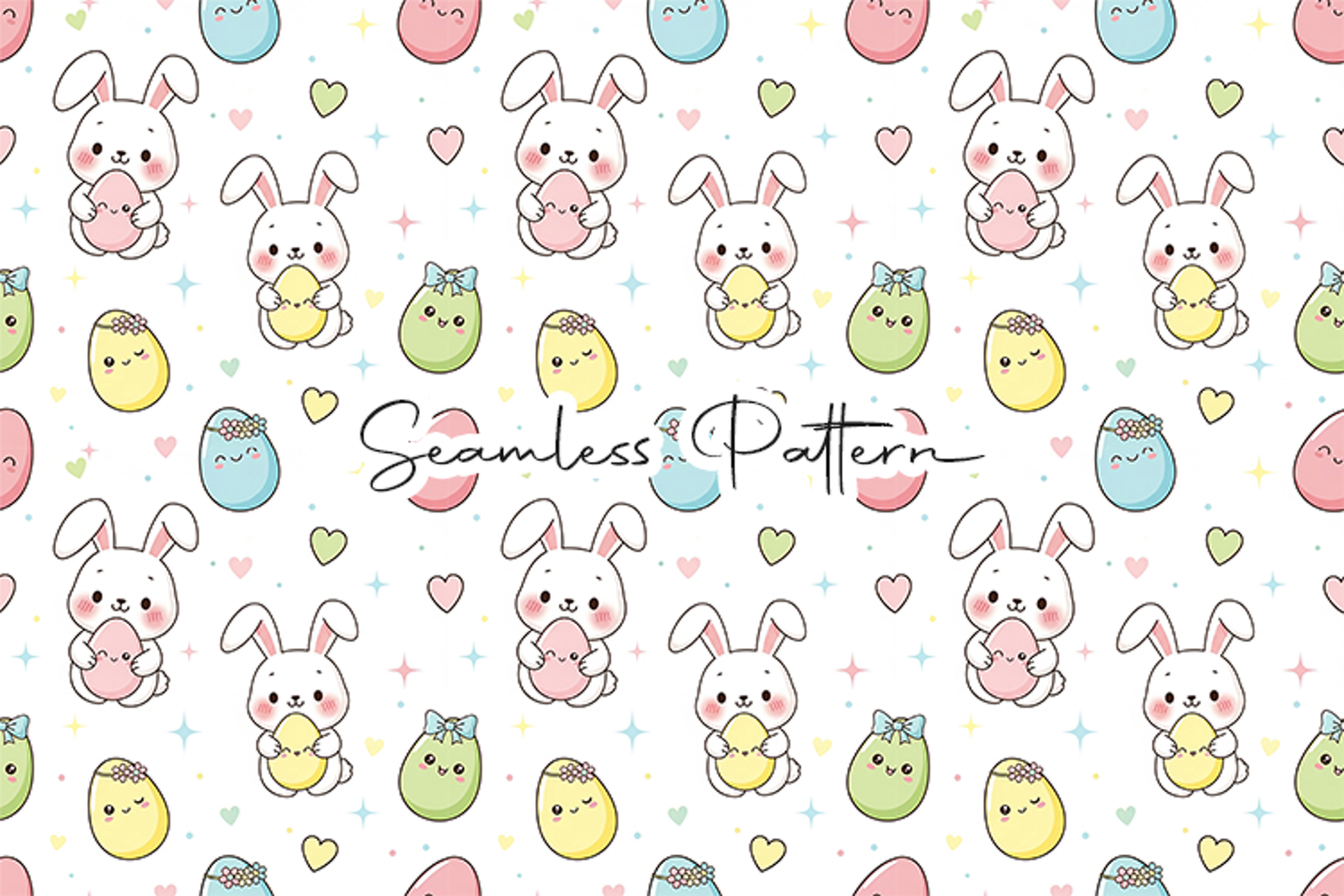 Adorable kawaii Easter seamless pattern featuring cute bunnies holding colorful eggs with pastel Easter eggs, hearts, and sparkles on a soft background. This high-quality 12x12 inch JPG file at 300 DPI is perfect for fabric printing, wrapping paper, scrapbooking, sublimation, digital paper, and Easter or spring themed creative projects.