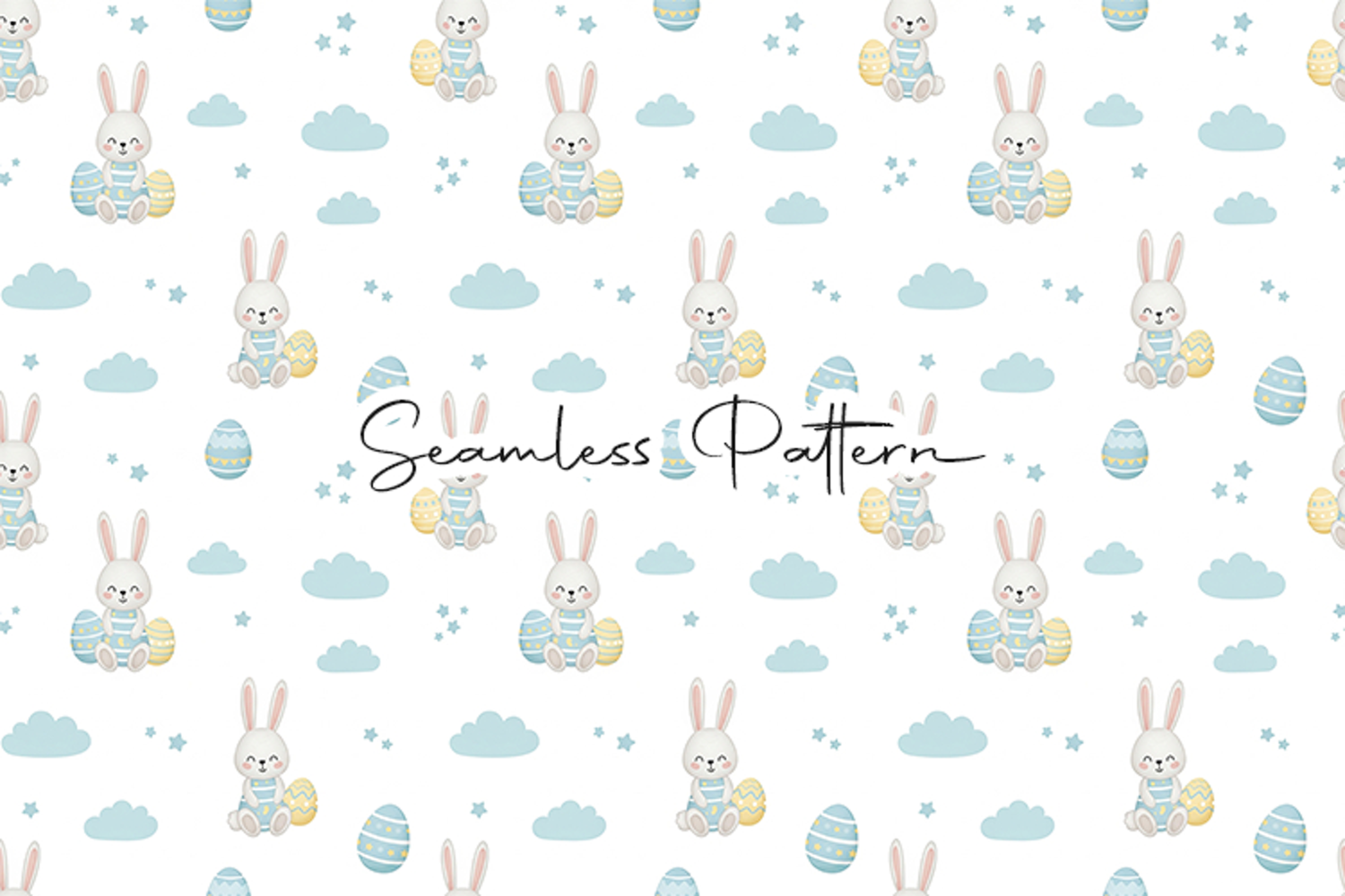 Adorable Easter seamless pattern featuring cute sitting bunnies holding decorated eggs with clouds, stars, and pastel Easter eggs on a soft sky background. This high-quality 12x12 inch JPG file at 300 DPI is perfect for fabric printing, wrapping paper, scrapbooking, sublimation, digital paper, nursery decor, and Easter themed creative projects.