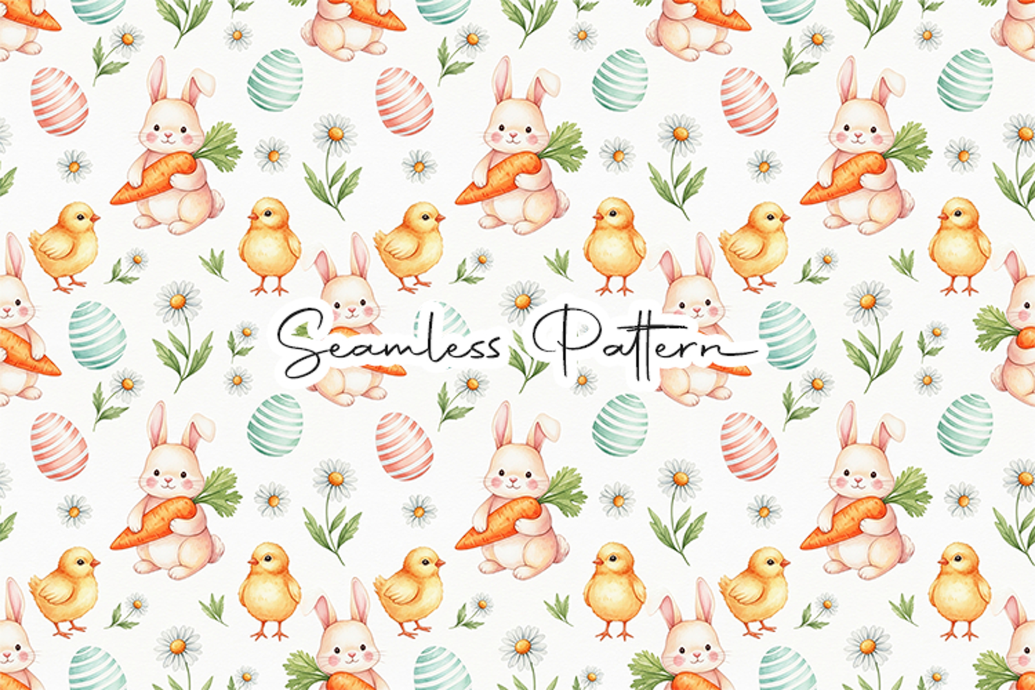 Adorable Easter seamless pattern featuring cute bunnies holding carrots, fluffy yellow chicks, pastel eggs, and delicate daisies in a soft spring style. This high-quality 12x12 inch JPG file at 300 DPI is perfect for fabric printing, wrapping paper, scrapbooking, sublimation, digital paper, and Easter themed creative projects.