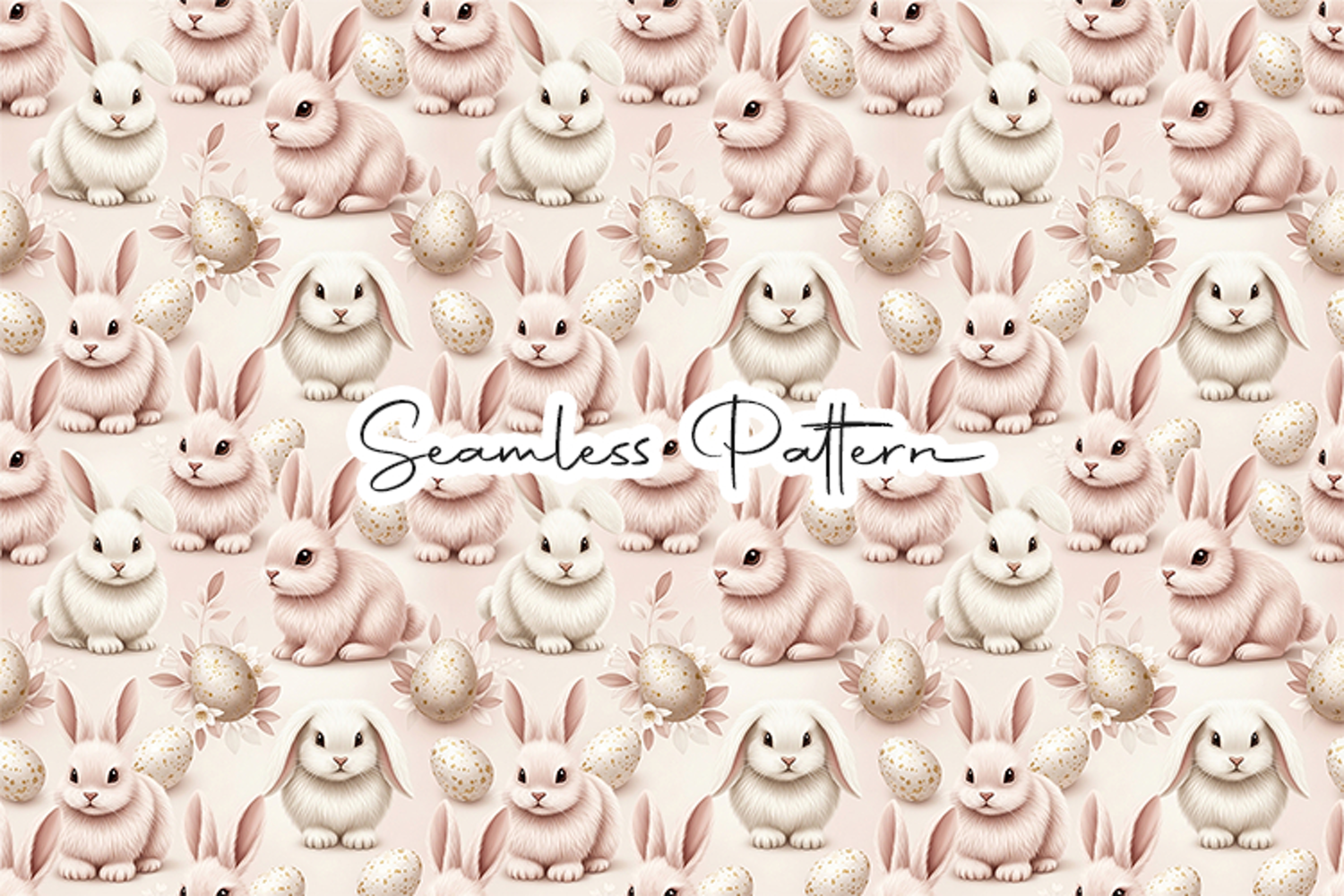 Adorable Easter seamless pattern featuring soft realistic bunny illustrations with decorated Easter eggs and delicate floral elements in pastel tones. This 12x12 inch JPG file at 300 DPI creates a smooth repeating pattern perfect for fabric printing, wrapping paper, digital paper, scrapbooking, sublimation, nursery decor, and Easter craft projects. Ideal for cute spring and holiday themed designs.
