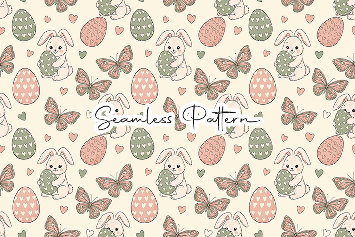 Charming Easter seamless pattern featuring adorable bunnies holding decorated eggs, delicate butterflies, and heart-pattern Easter eggs in soft pastel colors. This 12x12 inch JPG file at 300 DPI creates a smooth repeating pattern perfect for fabric printing, digital paper, scrapbooking, wrapping paper, sublimation, nursery decor, and Easter craft projects. Ideal for cute spring and kids themed designs.
