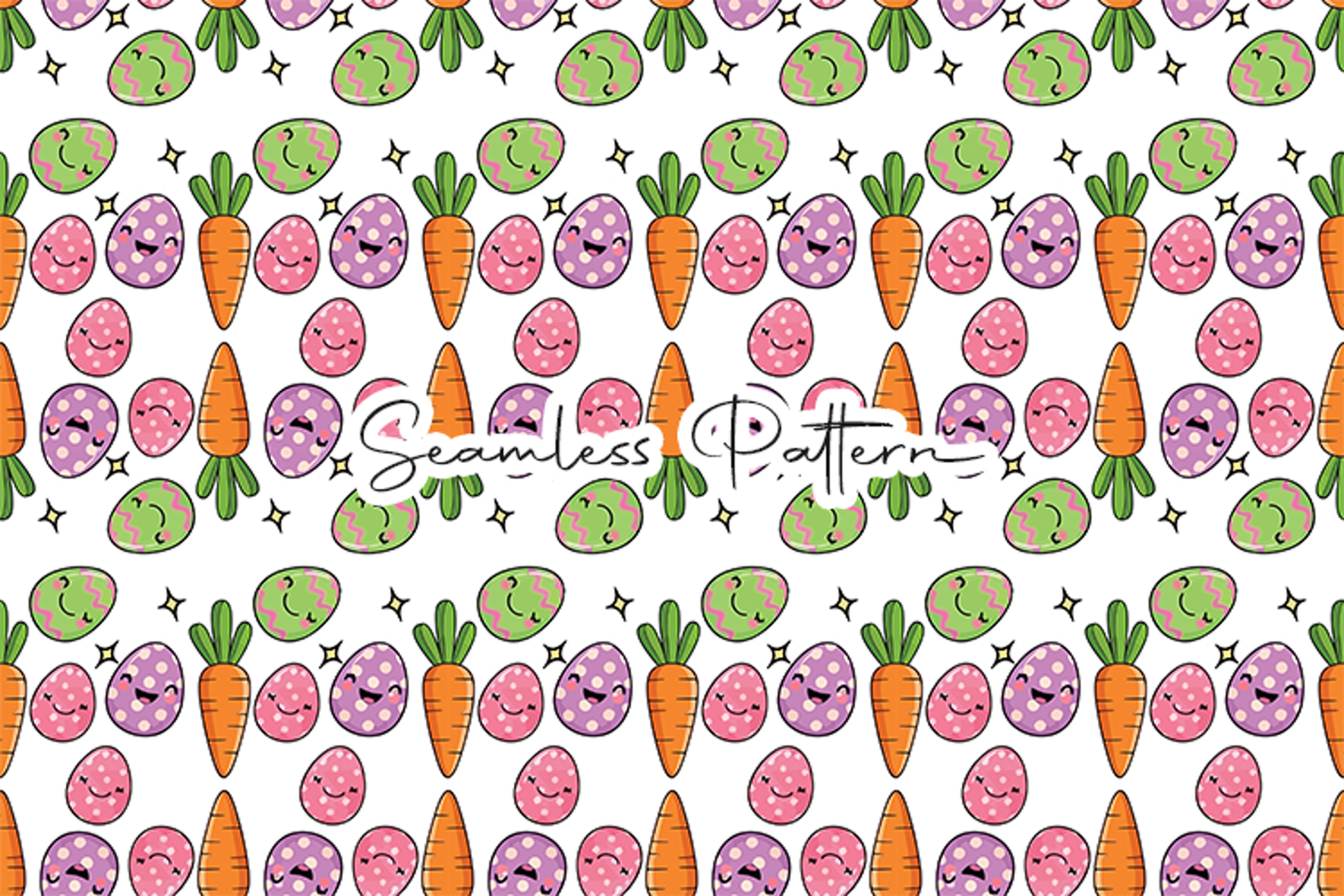 Adorable Easter eggs and carrot seamless pattern featuring cute decorated eggs with smiling faces and bright carrots arranged in a playful repeating design. Perfect for Easter and spring crafts, fabric printing, wrapping paper, scrapbooking, digital paper, and sublimation projects.
