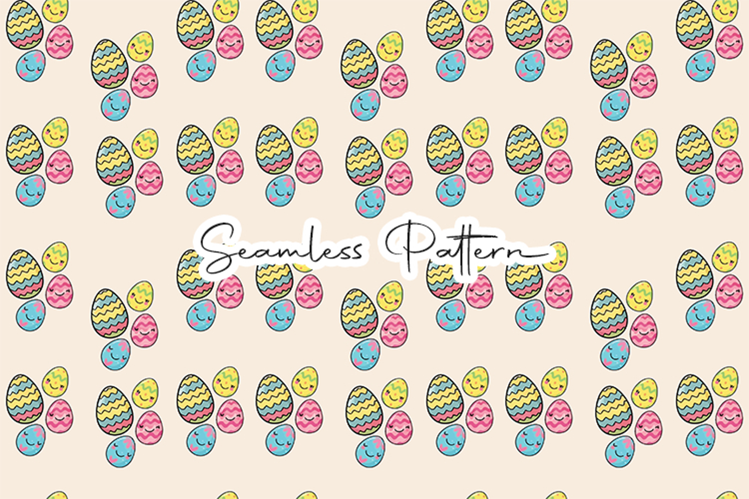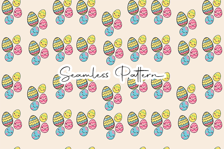 Adorable Easter eggs seamless pattern featuring colorful decorated eggs with cute smiling faces arranged in a playful repeating design. Perfect for Easter and spring crafts, fabric printing, wrapping paper, scrapbooking, digital paper, nursery decor, and sublimation projects.