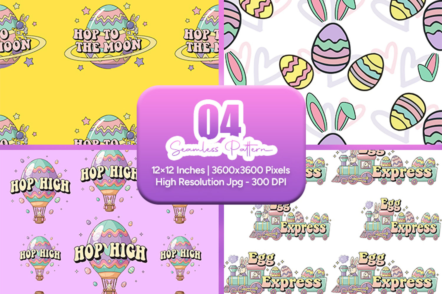 Fun and playful Easter seamless pattern bundle featuring pastel Easter eggs, cute bunny ears, hot air balloon “Hop High” designs, and whimsical “Egg Express” elements. These creative spring patterns add a cheerful and imaginative touch to seasonal projects.