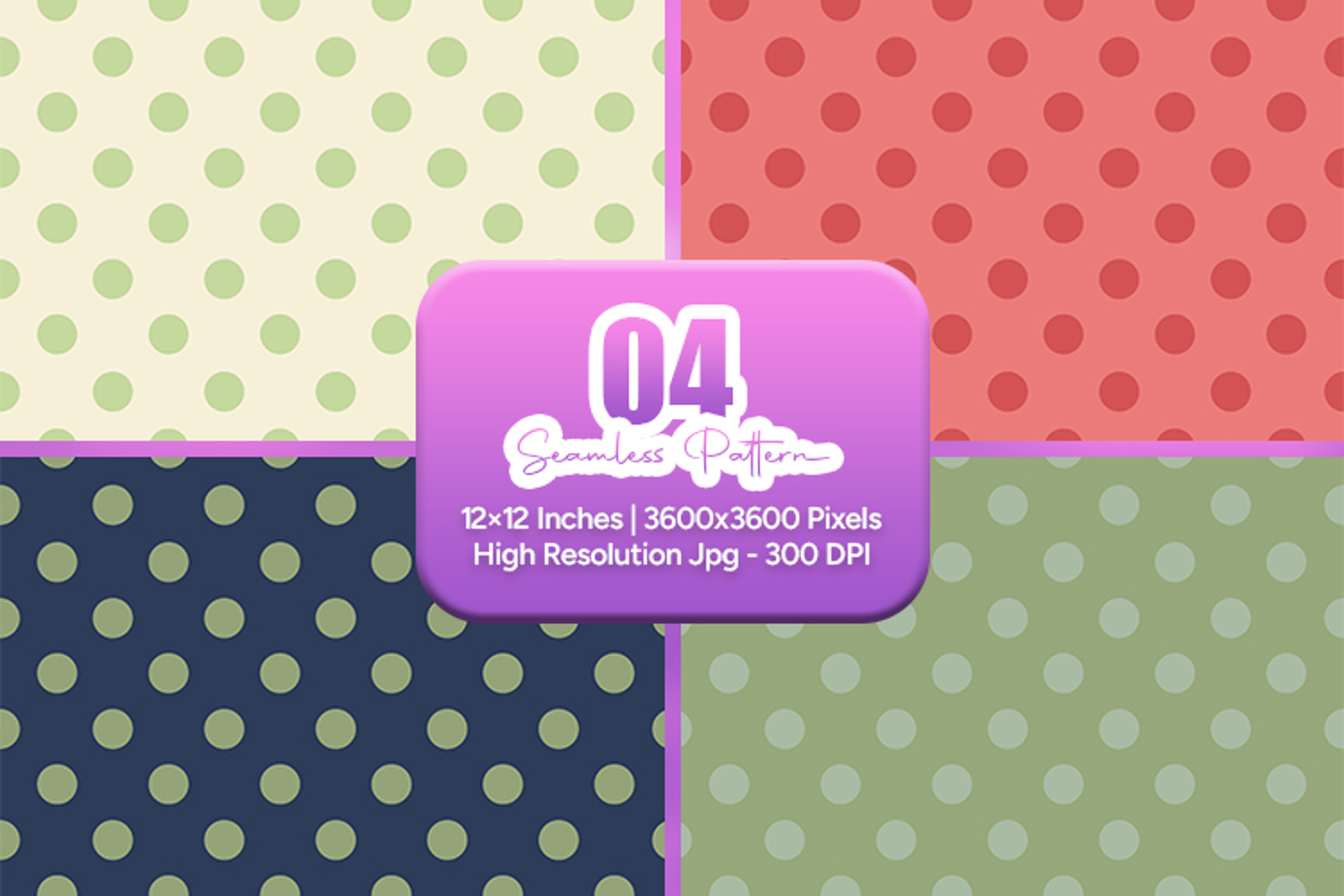 Trendy retro polka dot seamless pattern bundle featuring four bold color backgrounds with classic dotted repeats. Perfect for fabric printing, scrapbooking, wrapping paper, sublimation, digital paper, and creative surface pattern design projects.