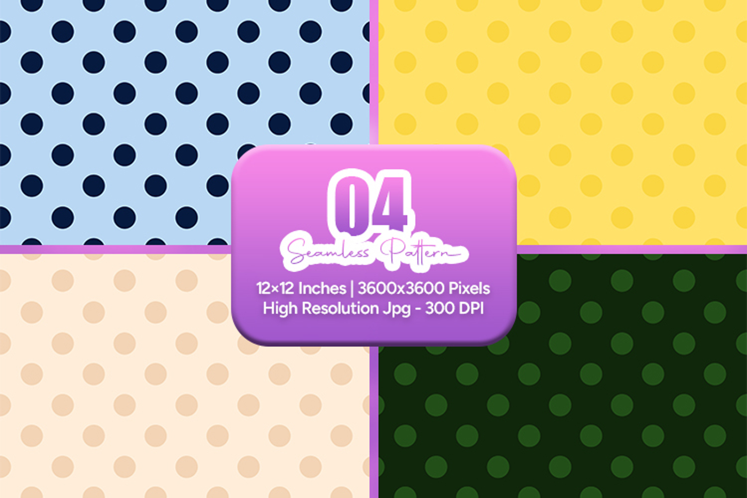 A stylish classic polka dot seamless pattern bundle featuring cool blue, bright yellow, soft beige, and deep green backgrounds with timeless dotted designs. These repeating patterns are perfect for fabric printing, wrapping paper, scrapbooking, sublimation, digital paper, and surface pattern design projects.