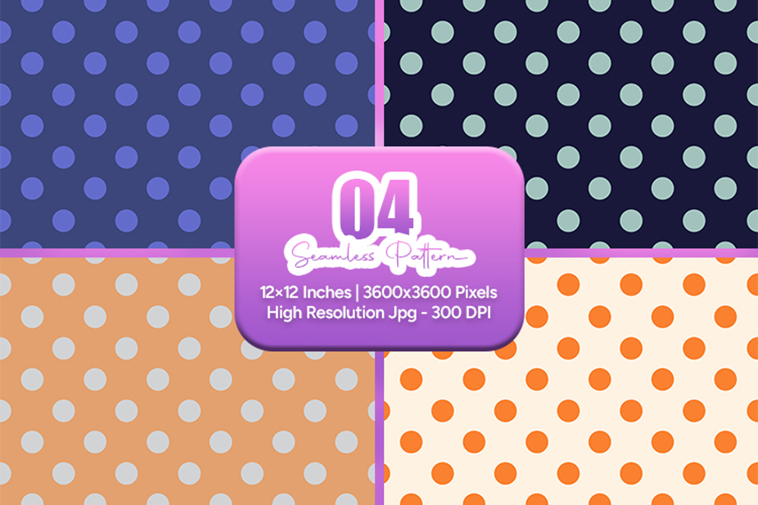 Stylish retro polka dot seamless pattern collection featuring playful dotted designs in vibrant and modern color combinations. This high-quality 12×12 inches seamless pattern (3600×3600 px), JPG format at 300 DPI is perfect for fabric printing, wrapping paper, scrapbooking, digital paper, sublimation, textile design, and creative craft projects.