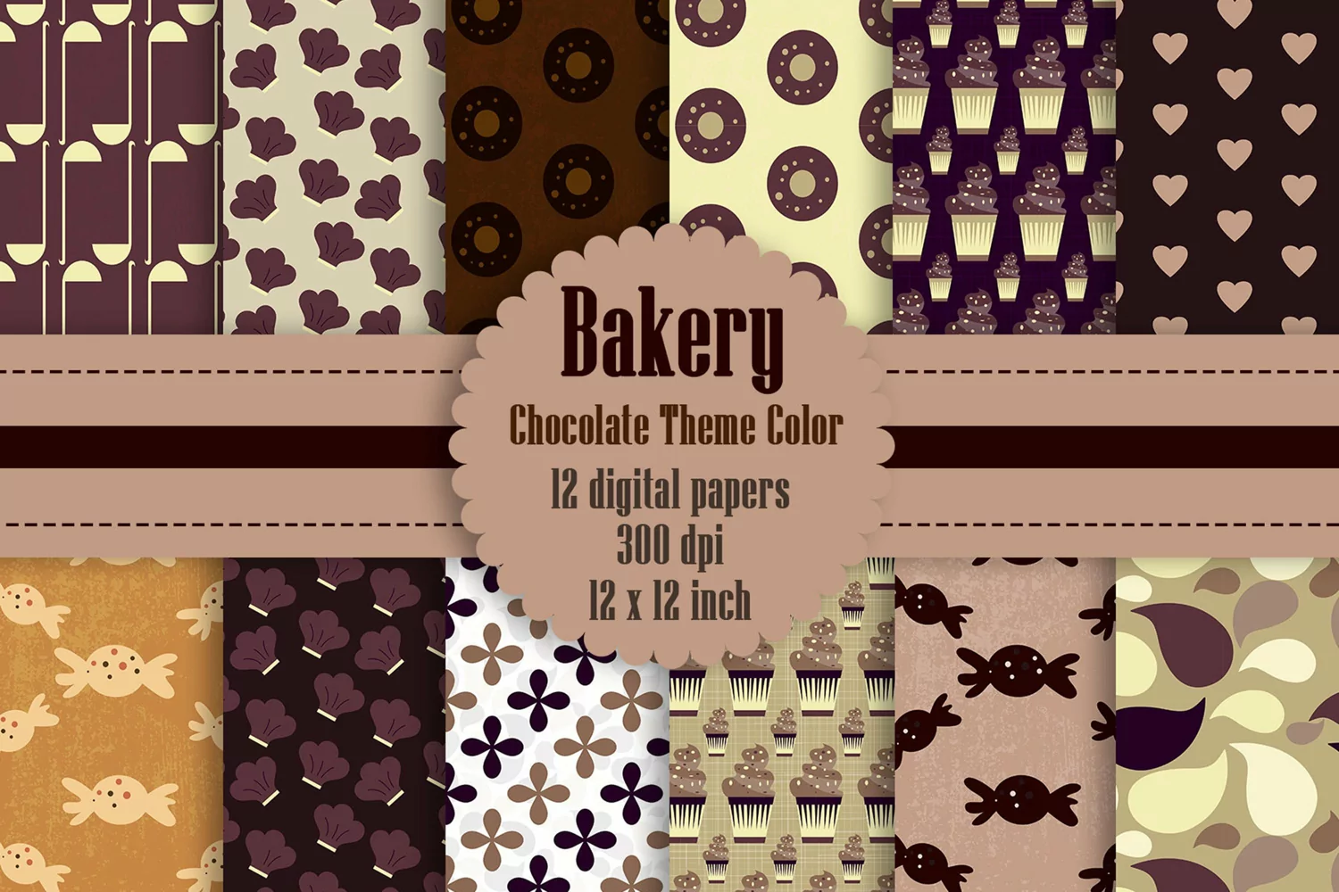 This pack will be available as 1 zip file which contains 12 JPG Images about Bakery Digital Papers in Chocolate Theme Color. Each paper was created with in 12 x 12 inches (30.48 cm) and has 300 dpi resolution for the best quality printing.