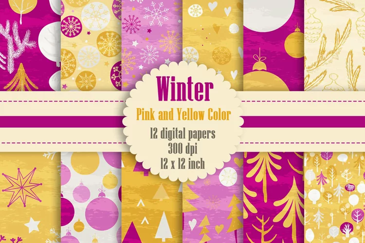 12 Winter Pattern Digital Papers in Pink and Yellow Color