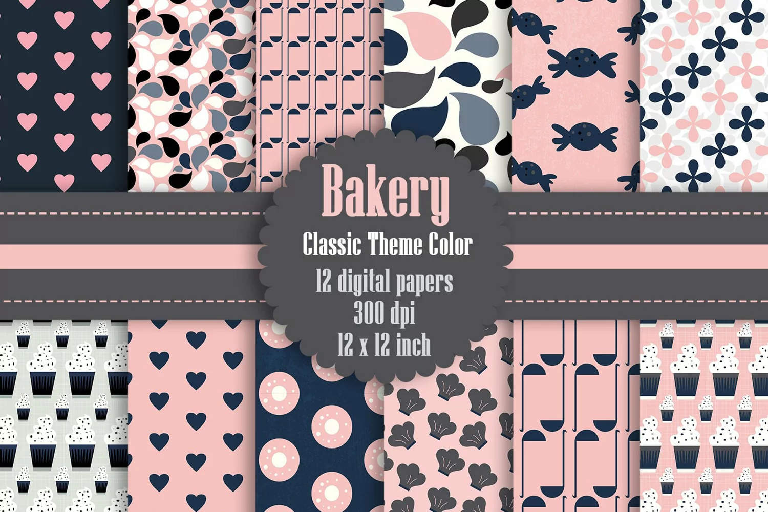 12 Bakery Digital Papers in Indigo and Blush Pink Color