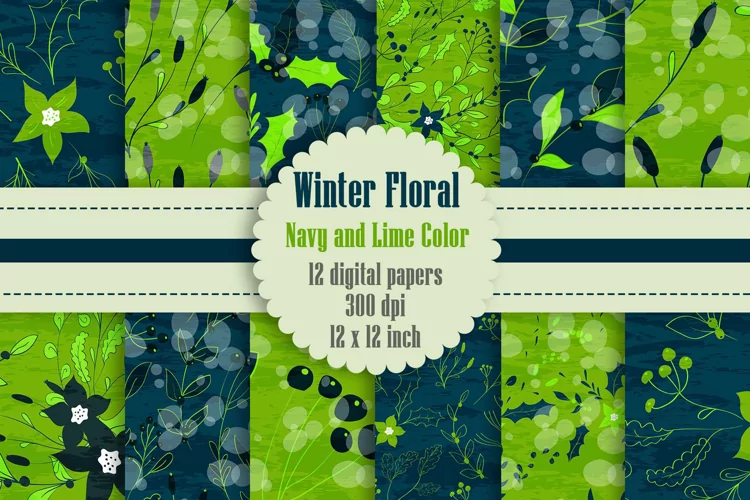 12 Winter Floral Digital Papers in Navy and Lime Color